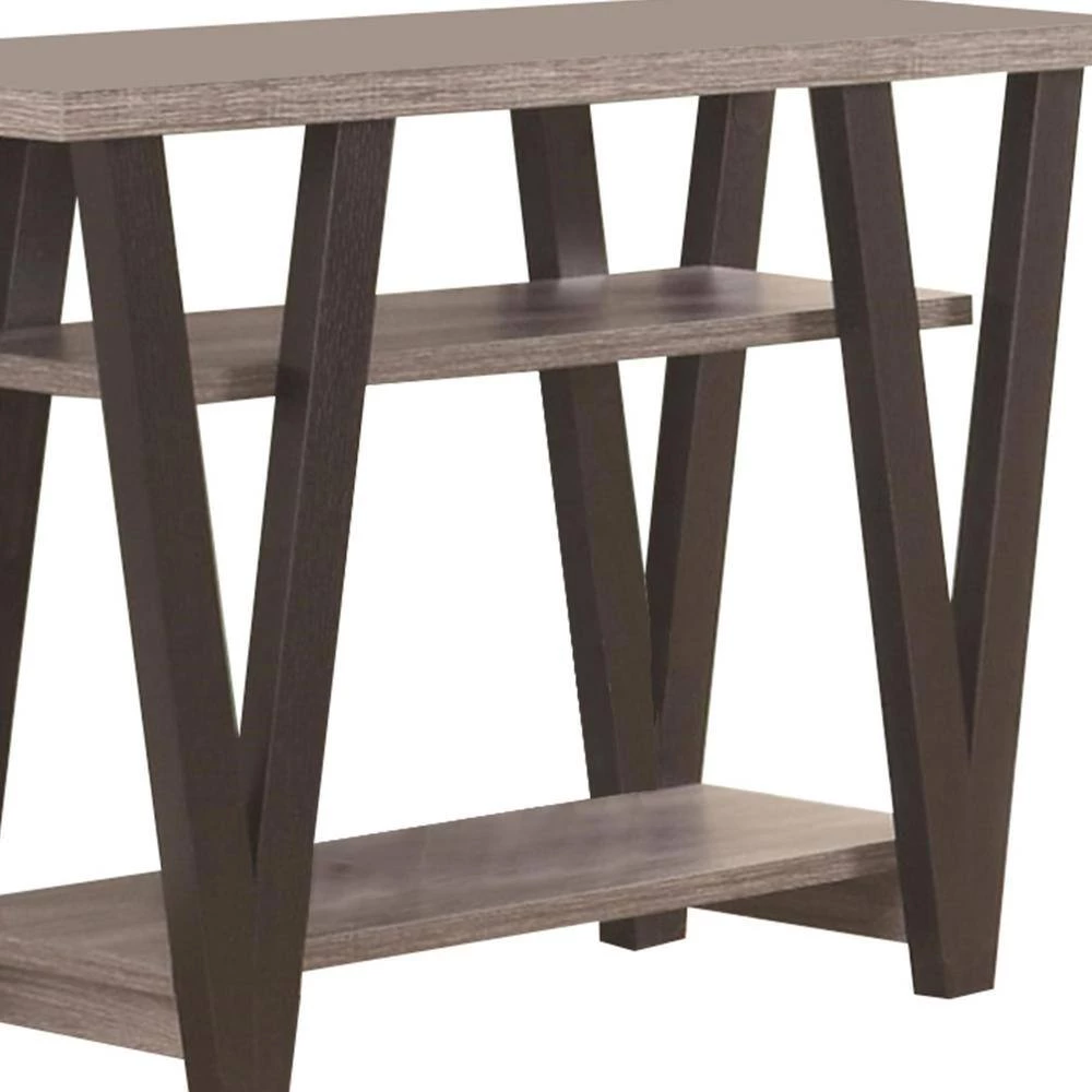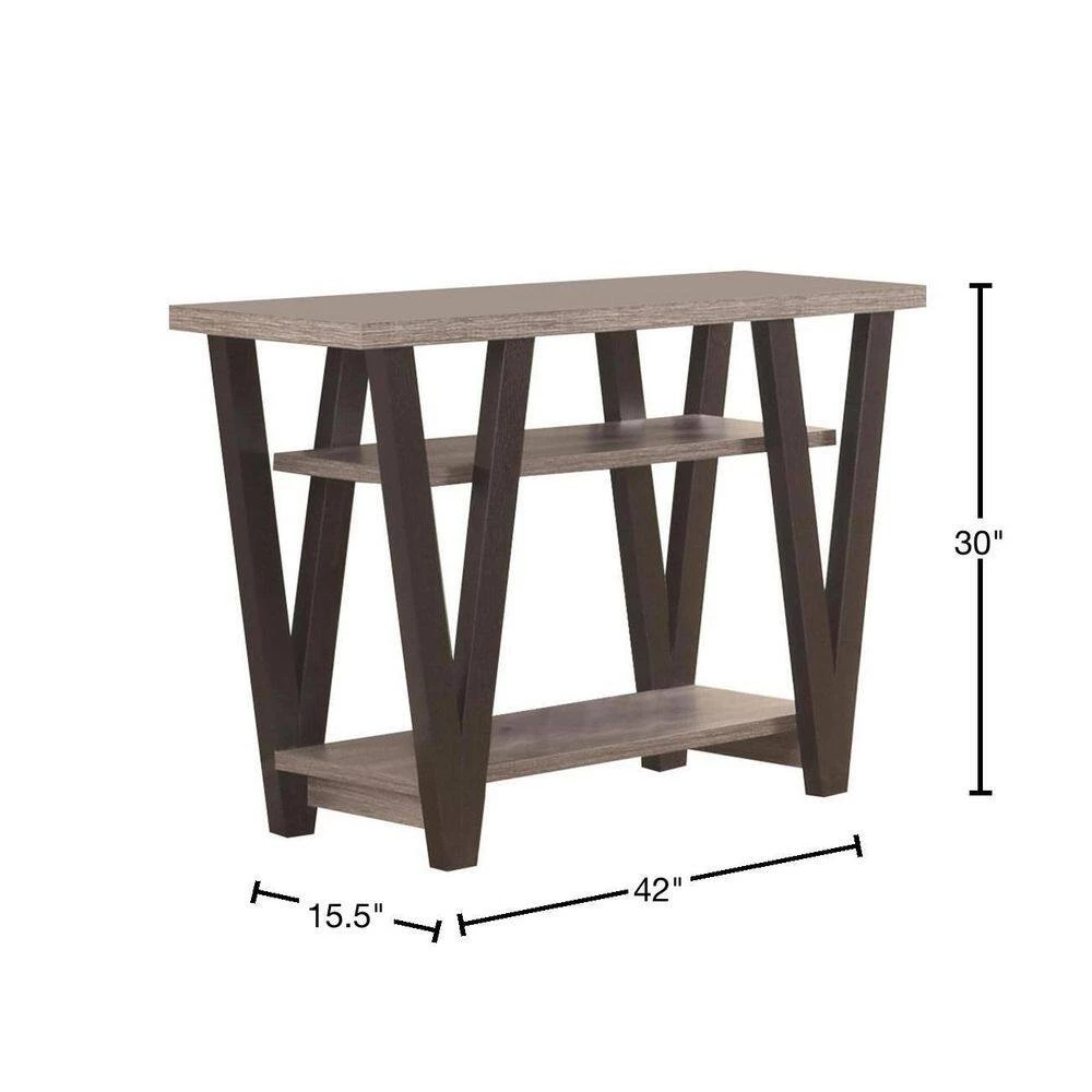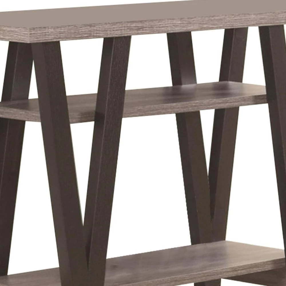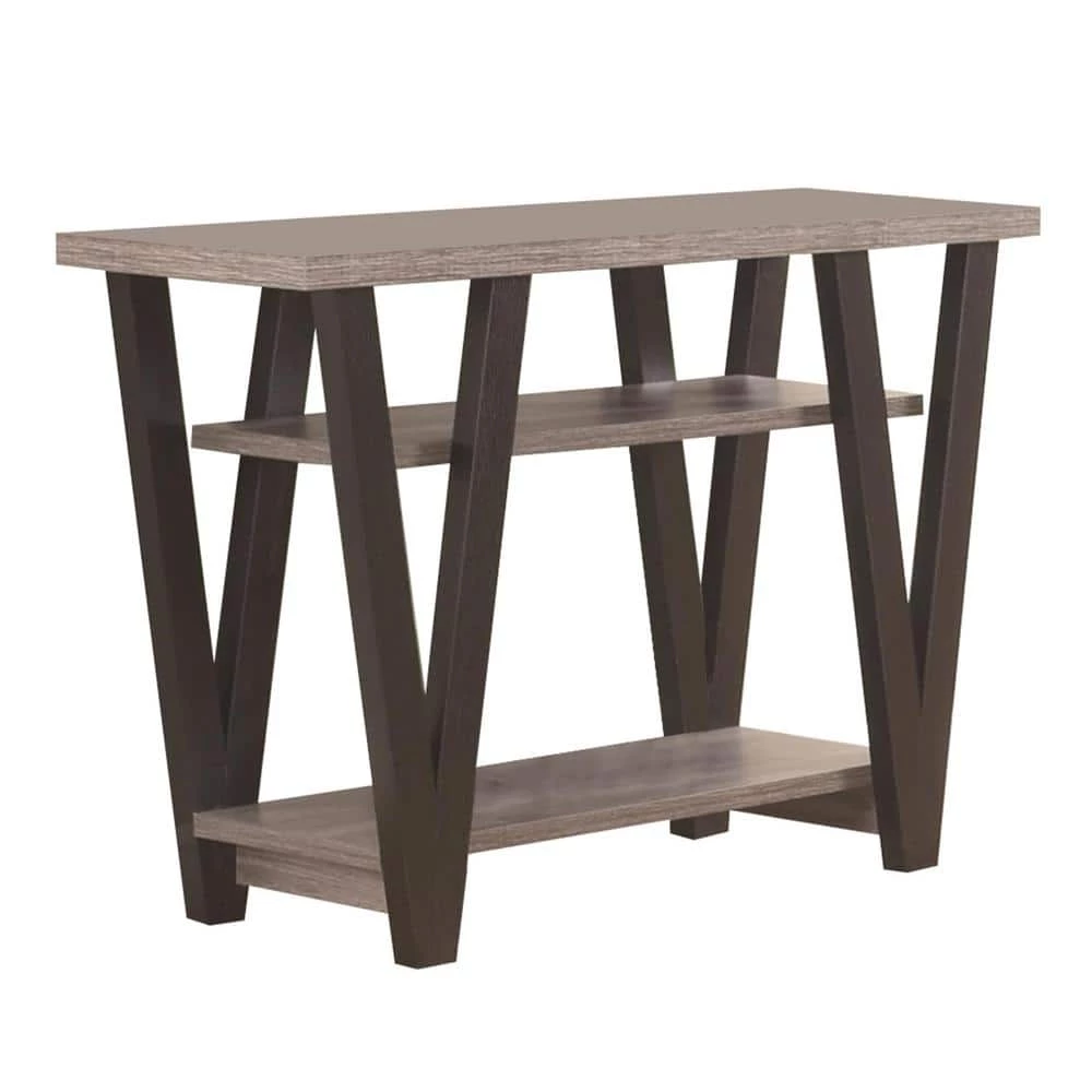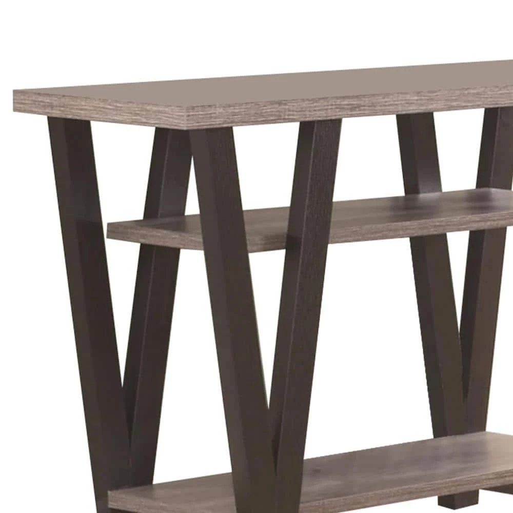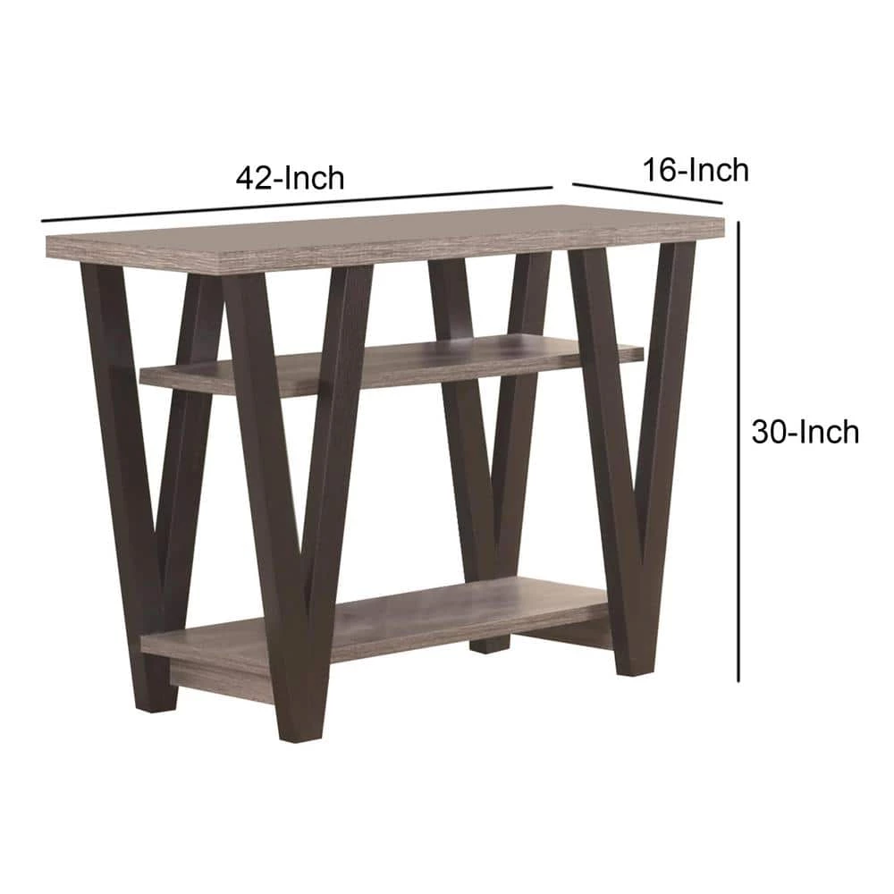 Lend your living area a retro look with this modish sofa table. Its rustic weathered gray finish lends antique mid-century charm to your interiors. Featuring an antique gray and black finish and an exceptional ‘V’ patterned zig-zag base, this sofa table is the perfect addition for any living room to create slight transformation with visual appeal. It also renders two open bottom shelves for additional display or storage.