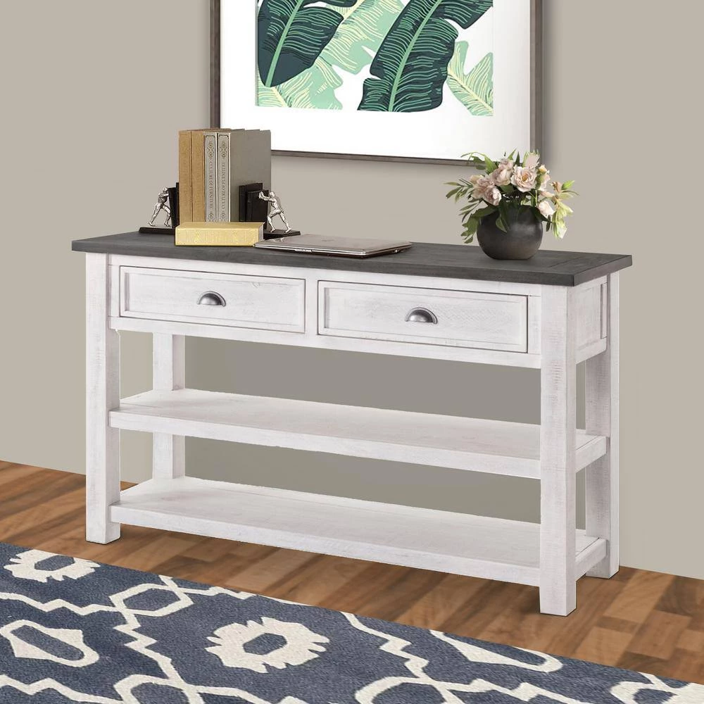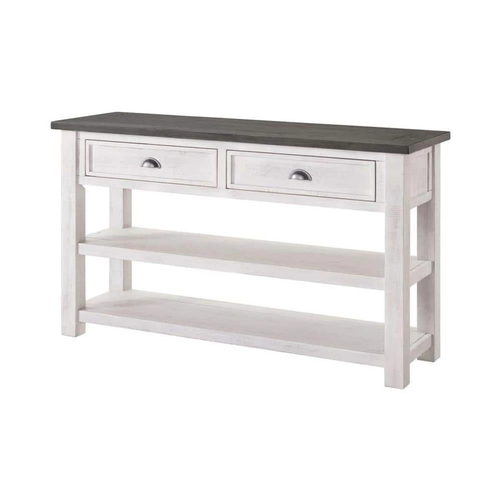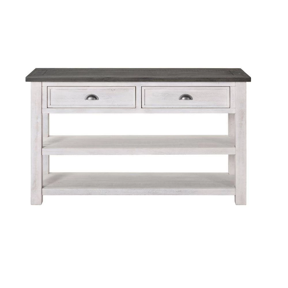Add a coastal touch to your interior with the inclusion of this Console Table. Featuring a sturdy pine wood construction in a white finish with gray top, it incorporates two drawers accented with metal pull handles for easy access. Supported on block legs, it includes two open bottom shelves at the bottom that provides additional storage space.
