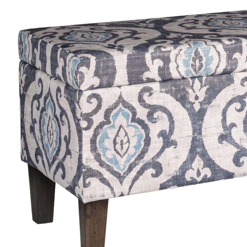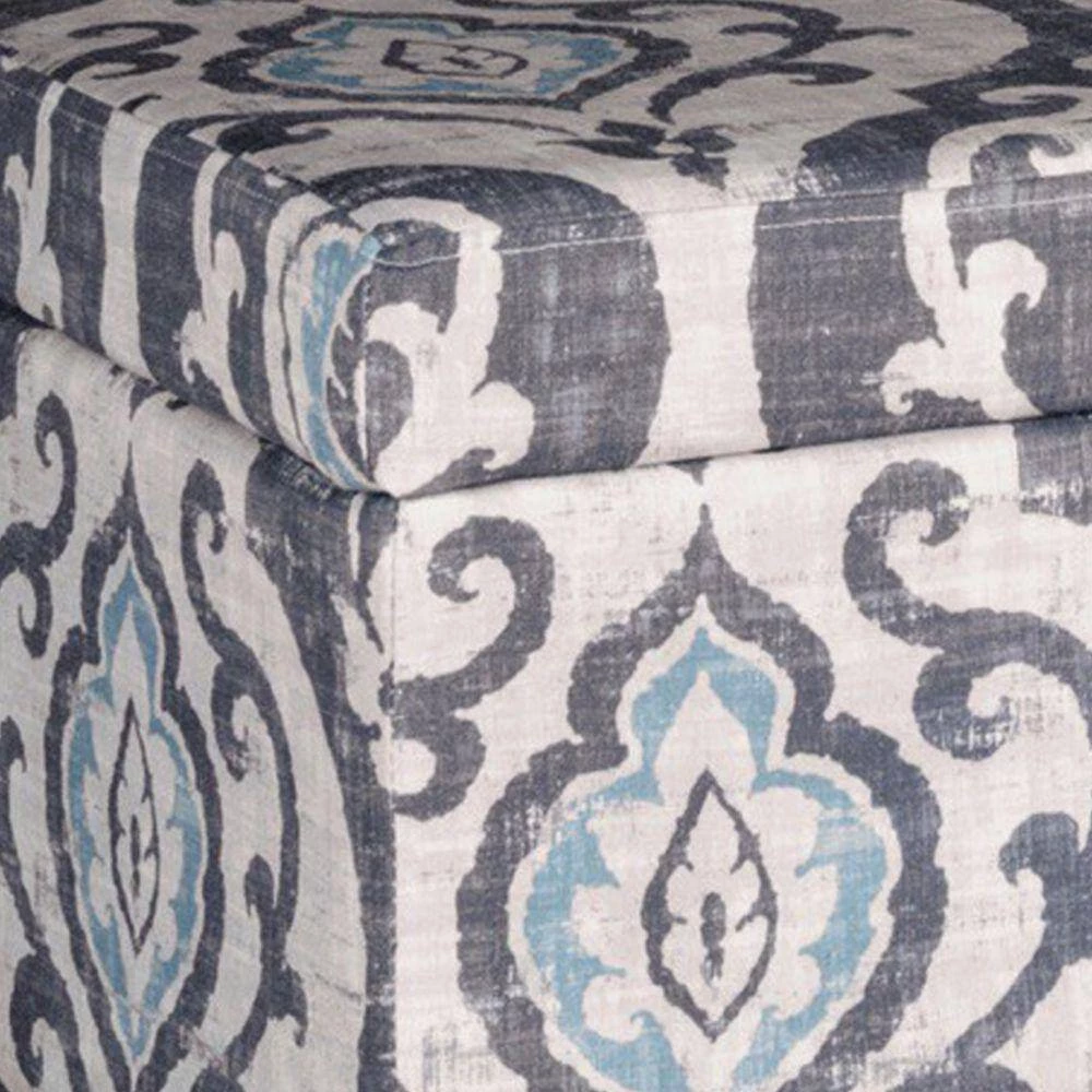 This large sized decorative bench is perfect to give multiple solutions in furniture setting. Sturdy constructed using wood and plywood, this classic looking rectangular storage bench is covered by damask pattern fabric. Featuring a beautiful pattern in a color of blue, gray and cream, this decorative storage bench has wooden tapered legs in a brown finish. This incredible inclusion is ideal to be used in any room from living room to bedroom as an extra seating for lounging.