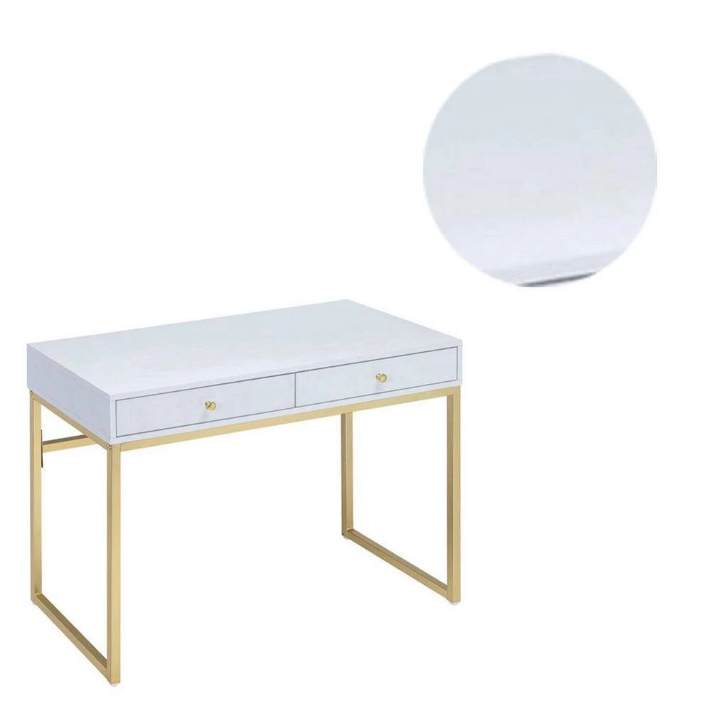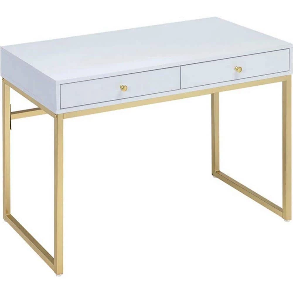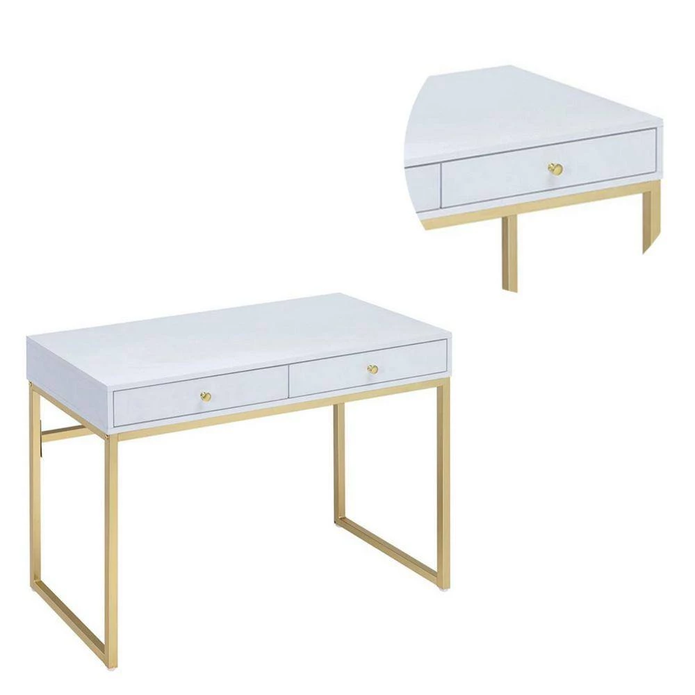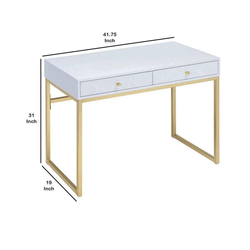 Get this inspired look captivating writing desk for your office and working space to re-theme it with a contemporary accent. Featuring a white and gold finish, the desk features 2-engineered wood drawers with gold color knob pull and stacked metal sled legs. The storage drawer allow you to store paper files or important office treasures in 1-go. Made up of wood and metal, this desk will coordinate with any color scheme. This furniture piece is perfect to be set in the home office, study room or office. Does not include any featured product other than 1-desk only.