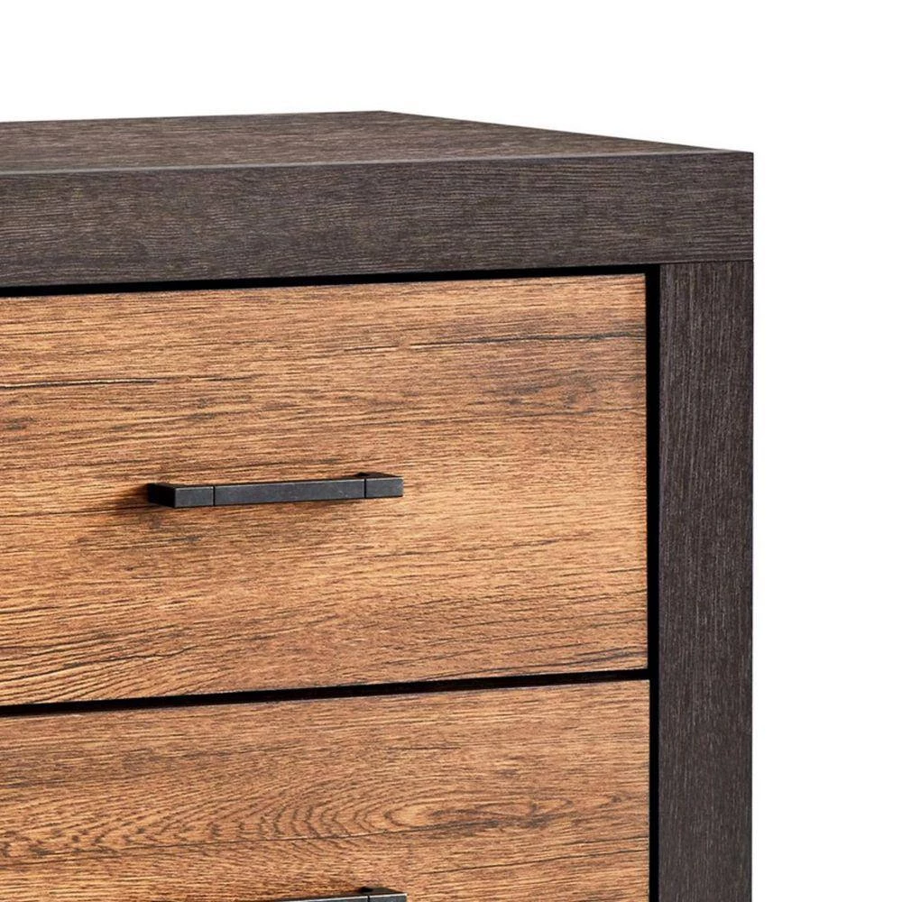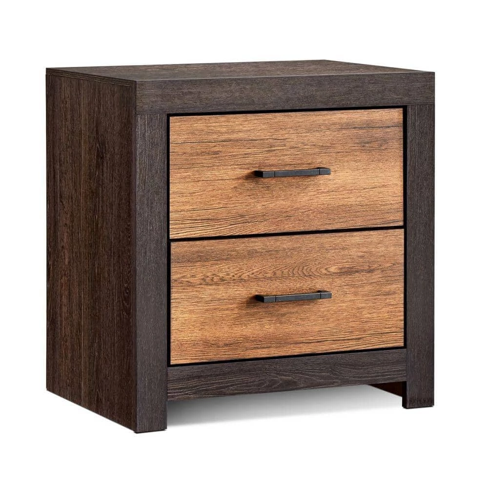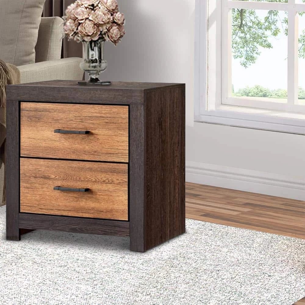 Give a crude vibe to the entire modern setting of your home with the inclusion of this nightstand. 2 drawers with metal bar pulls adds to the storage space. The dual tone brown finish makes it stand out. The rough hewn sawn texture adds to the rustic look of the piece.