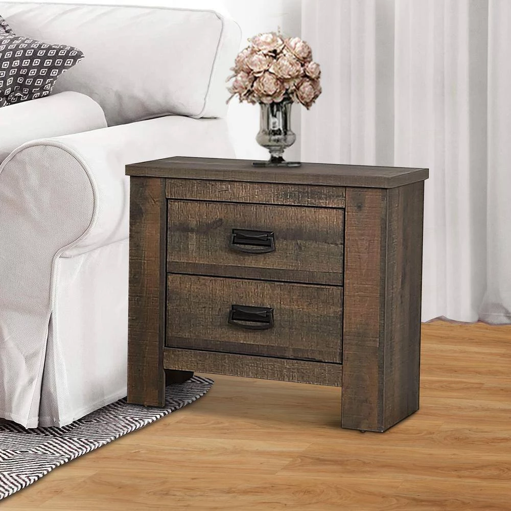 Keep your bedtime essentials handy and organized with this Nightstand, which comes with 2 smooth gliding drawers and saw hewn texture. Accented with 3 dimensional paper veneer, it is constructed sturdily from the combination of hardwood, MDF and particleboard. It will enhance the look of space.