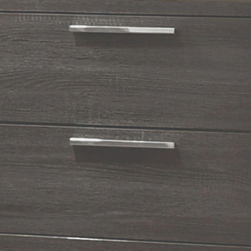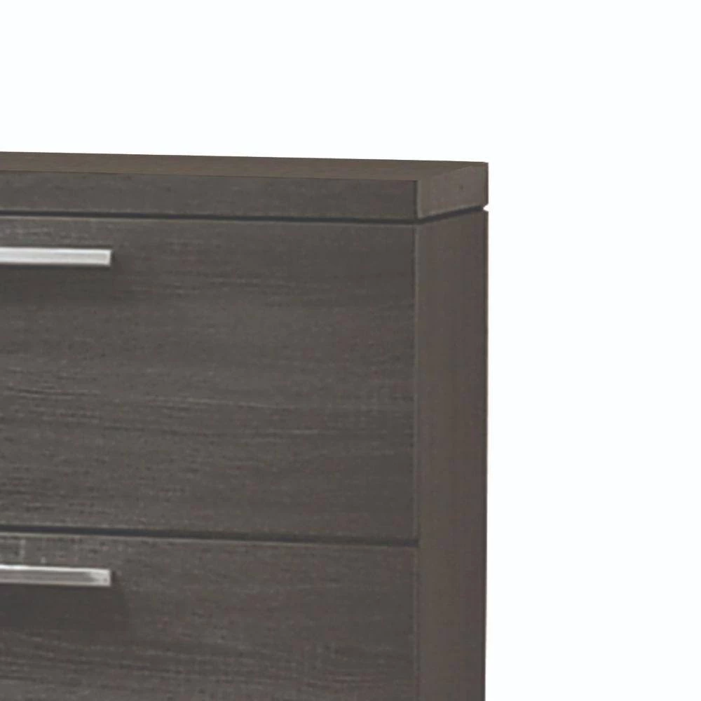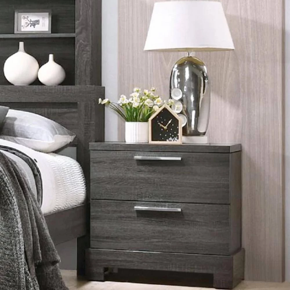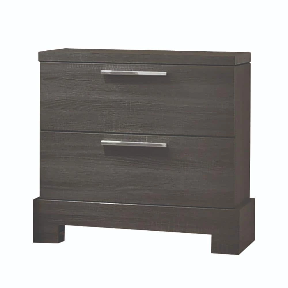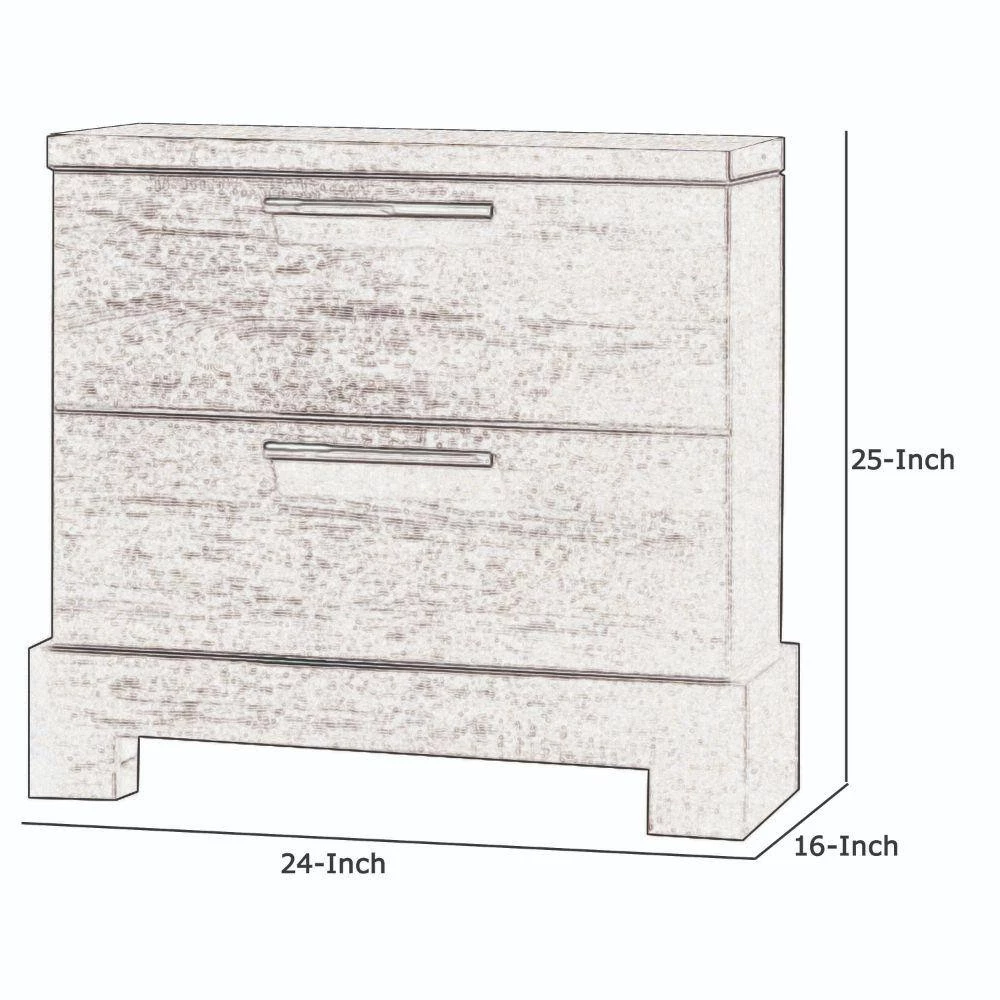Add an additional space to your bedroom with this sturdy wooden constructed nightstand featuring transitional style. 2 drawers with metal bar pulls provide ample space. It has been accented with wood grain details.