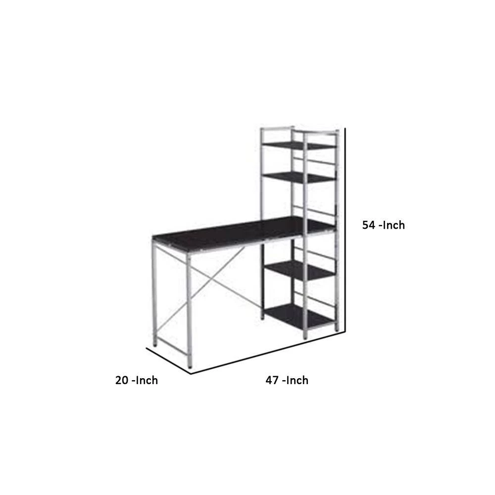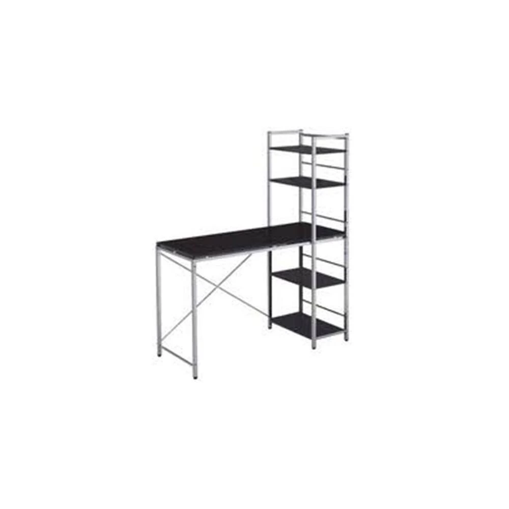 This Chrome plated computer desk is a contemporary addition to your workspace. This desk has a black finish with chrome base, and with its built in book case for storing your books, CDs, and other necessities, this desk is sure to upgrade any room. One side the wide black wood desktop with plenty of room for using your laptop, writing, or studying, while on the other side is a five shelf black glass book shelf with bar backstops to hold all your books and studying materials. Some Assembly Required.