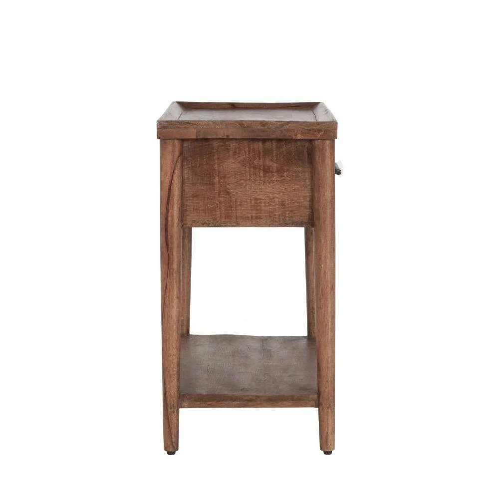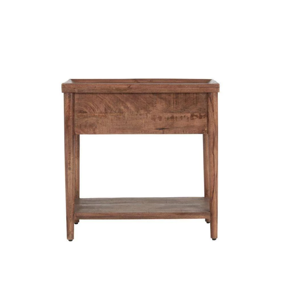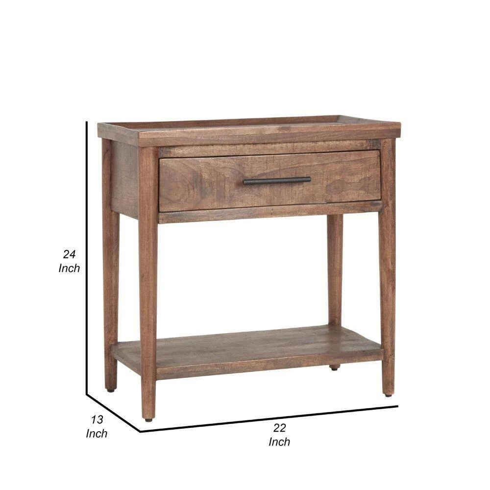 Embrace transitional modernity in your living room, study, or lounge with this sophisticated and charming end table. Naturally embellished with wood grain details, this end table consists of a wide, spacious tabletop, an inside drawer and a lower shelf, making it a perfect piece of additional living room storage and a grate spot for casual decoration.