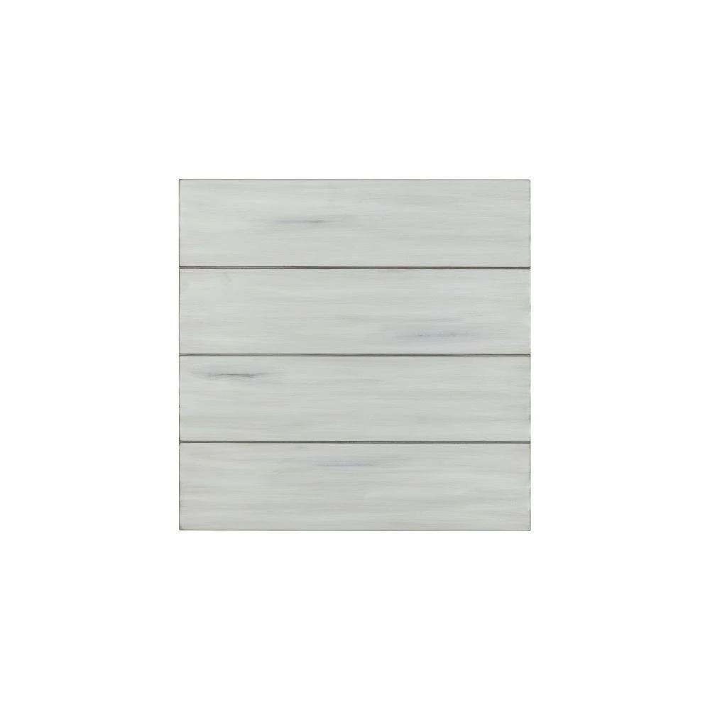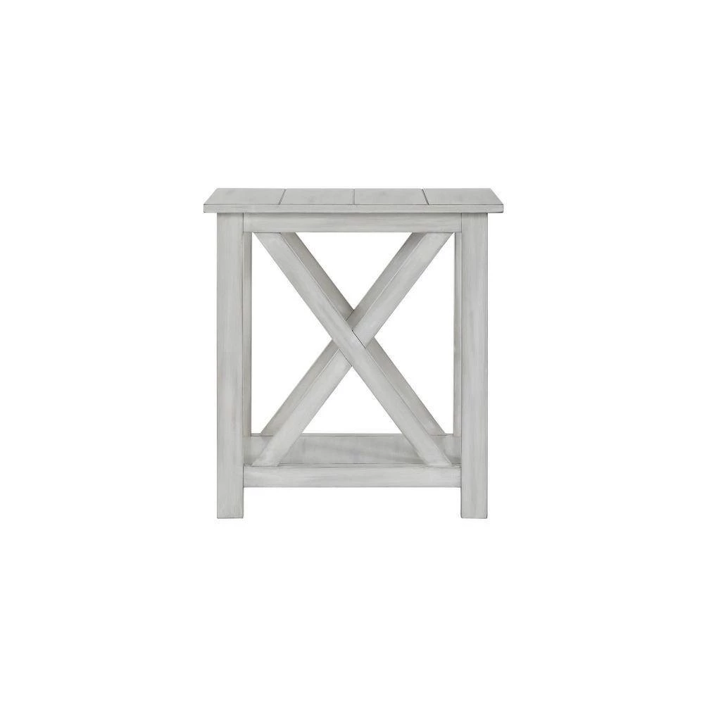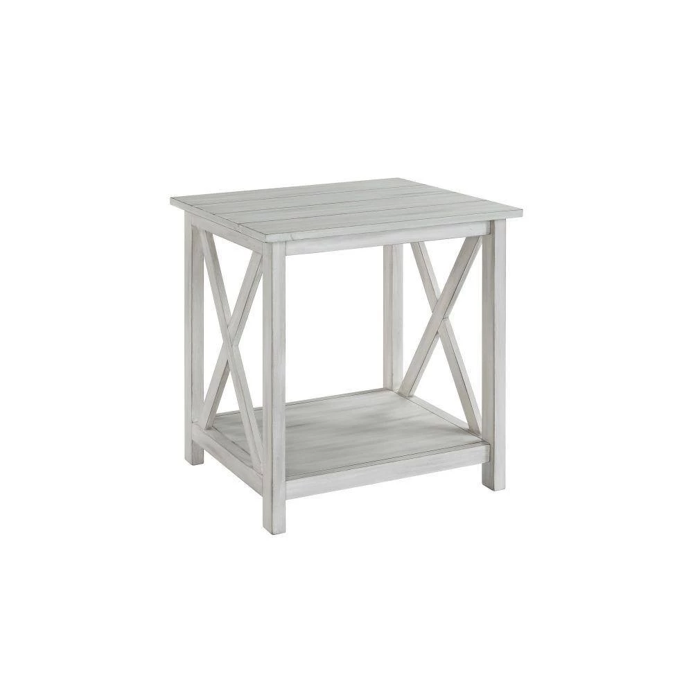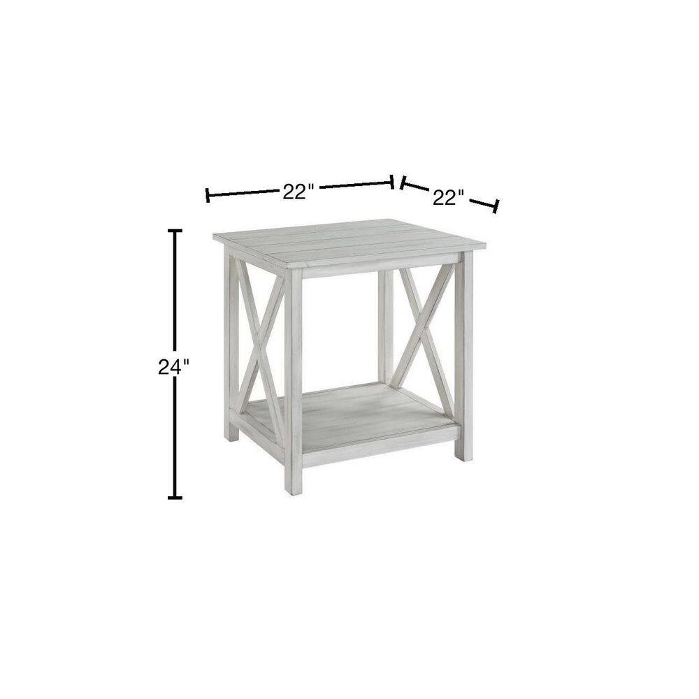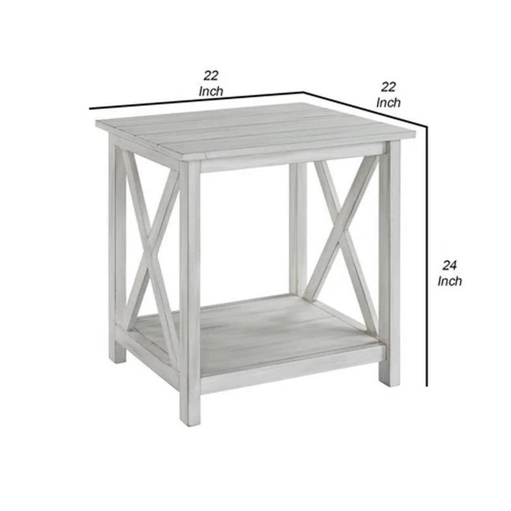 Embellish your entire space with the most appreciated farmhouse style end table. With plank design top, it has 1-open bottom shelf which makes it extremely useful and functional. Wooden block legs with X shaped accents adds to the beauty and strength. The washed white finish adds to the crudeness and raw appeal.