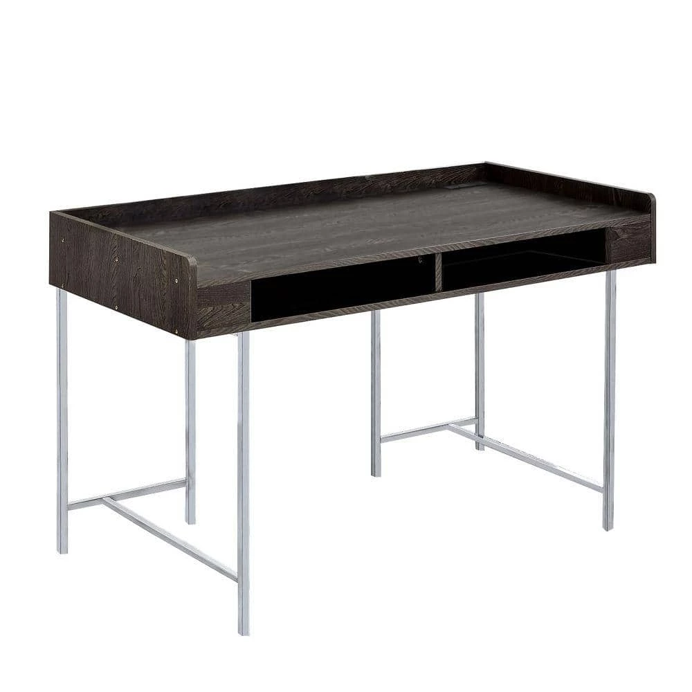 Make your home office space more efficient and entrancing with the elegance of this contemporary Desk. The solid wood constructed top is complemented with a chrome tubular metal base. The USB and power outlet makes this table a versatile piece for your workstation.
