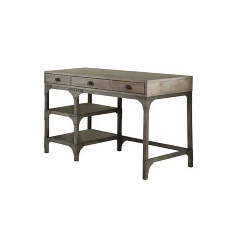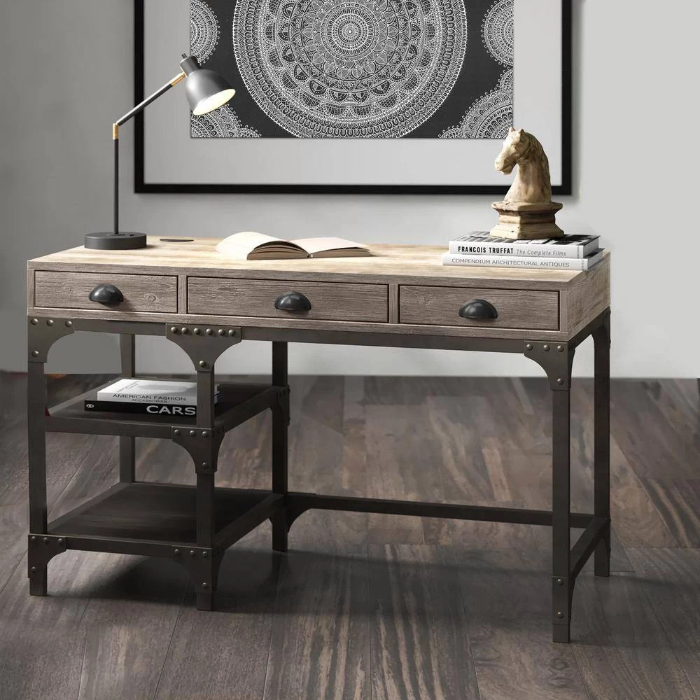 Grant an industrial touch to you work space with the inclusion of this classic desk. It features a wooden top with 3 spacious drawers that can be accessed by metal cup pulls. It is supported by a metal frame, incorporating 2 storage shelves and showcases corner brackets with rivet details.