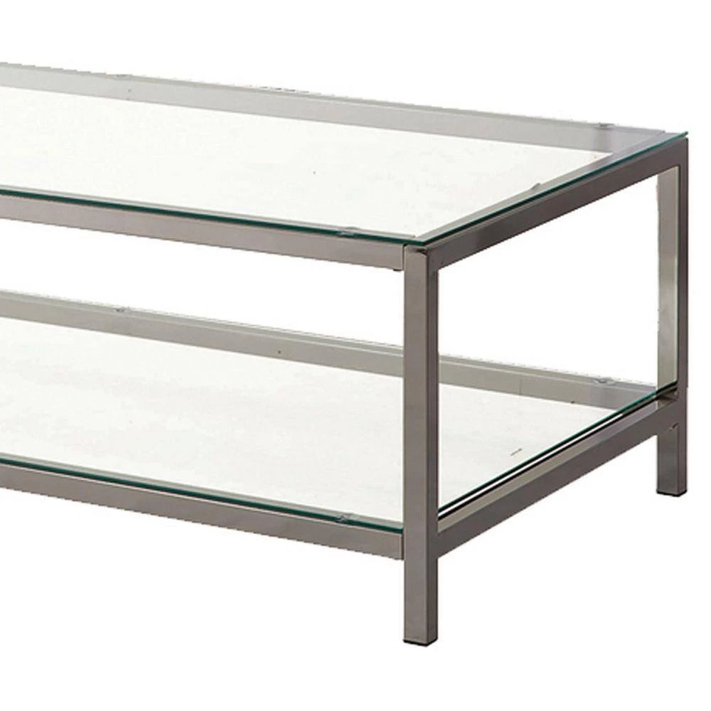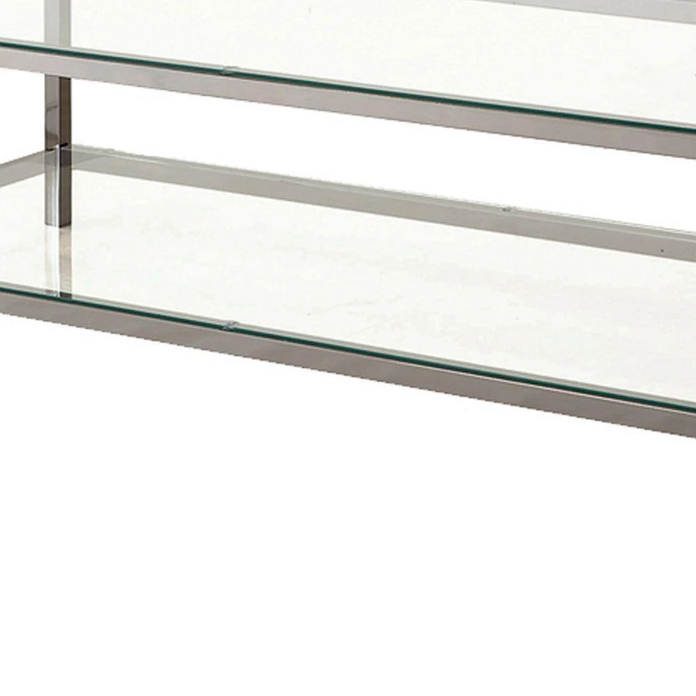Revive your living space by bringing in this contemporary style Coffee Table which comes with glass top and bottom shelf. Supported sturdily on tubular metal legs. It is accented in the hue of silver.