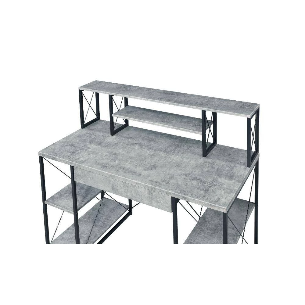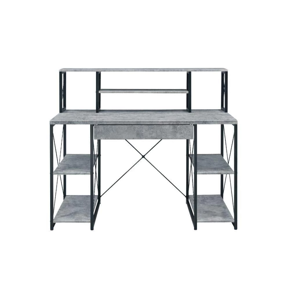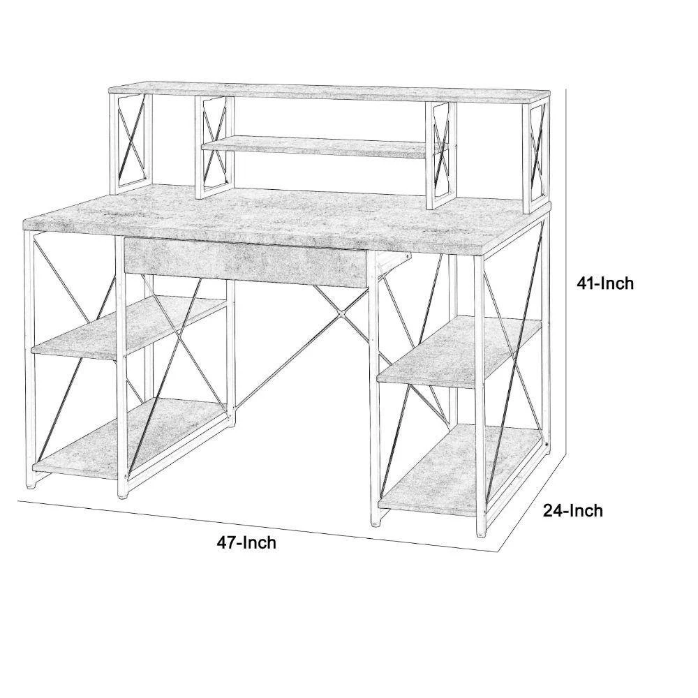 Enjoy working at home on this highly spacious and luxurious desk. It features a metal frame with X-shape side frames encasing 4-open bottom shelves, 2 at each side and a drawer at the center. The hutch incorporates a single shelf, a flat rectangular top and an open compartment at each side.