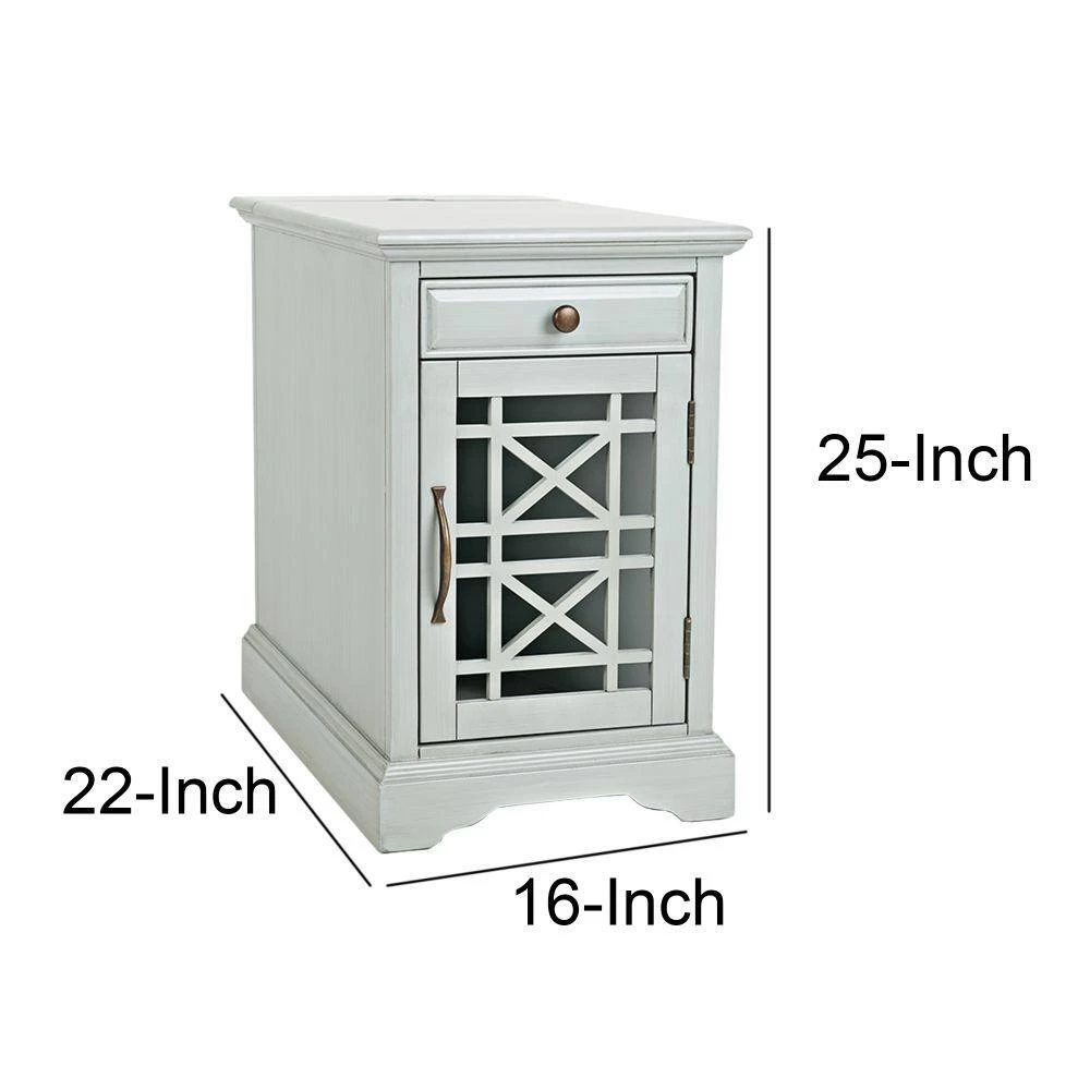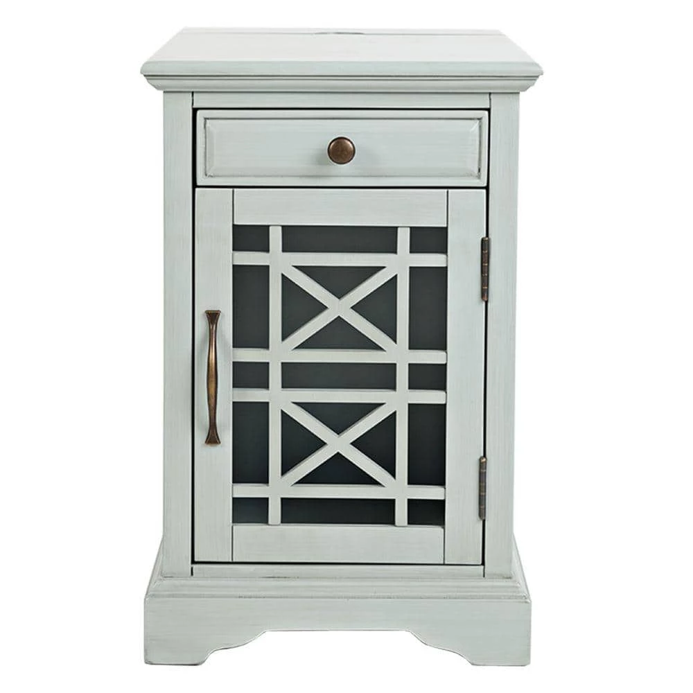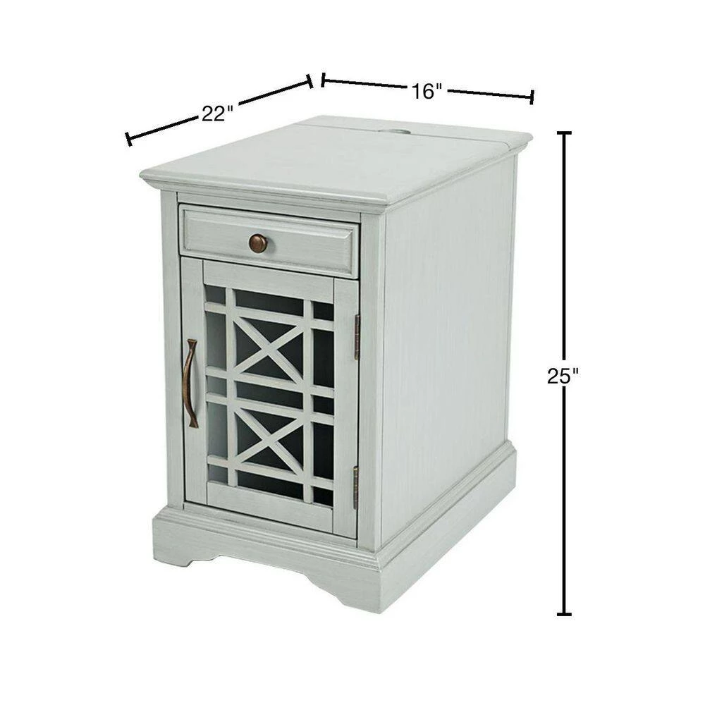 This chairside table is a useful yet beautiful addition for home. Incredibly designed with a earl gray(light gray) finish, this cabinet has 1-door and 1-drawer for easy storage space. Both drawer and door has antique hardware that makes it a real treasure and it also have a hidden charger space. Now charge your tablet or plug-in a table lamp without have a tangle of cords. Its beveled cabinet top features “X” motif detailing over the glass doors and its power unit has two outlets and two USB ports. Drawer Dimension: 9.75 in. W x 11.25 in. D x 2.25 in. H. Cabinet Opening: 12 in. W x 15.5 in. H. Area Dimension Behind Door: 12 in. W x 19.5 in. D x 15.5 in. H. Top Surface Area Without Flip-top: 16 in. W x 17.5 in. D.