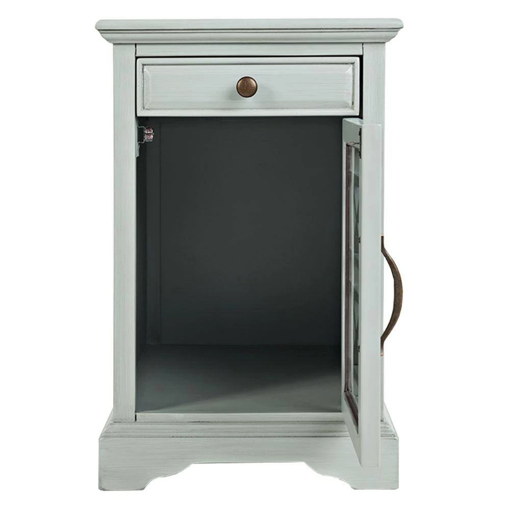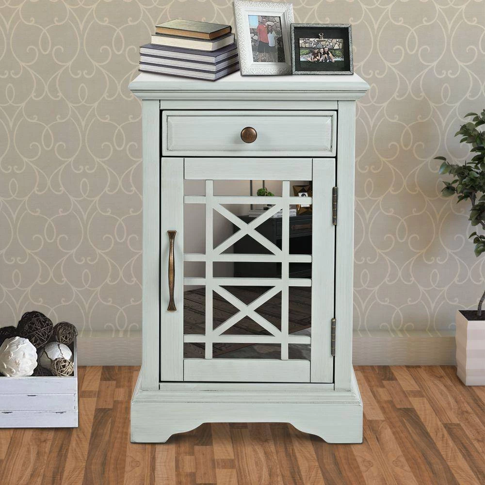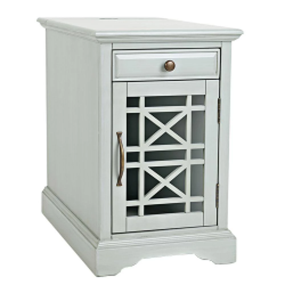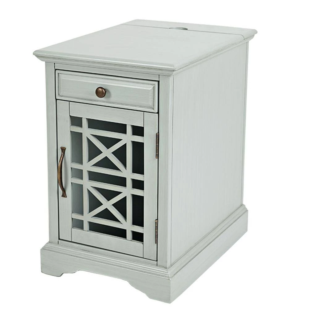 This chairside table is a useful yet beautiful addition for home. Incredibly designed with a earl gray(light gray) finish, this cabinet has 1-door and 1-drawer for easy storage space. Both drawer and door has antique hardware that makes it a real treasure and it also have a hidden charger space. Now charge your tablet or plug-in a table lamp without have a tangle of cords. Its beveled cabinet top features “X” motif detailing over the glass doors and its power unit has two outlets and two USB ports. Drawer Dimension: 9.75 in. W x 11.25 in. D x 2.25 in. H. Cabinet Opening: 12 in. W x 15.5 in. H. Area Dimension Behind Door: 12 in. W x 19.5 in. D x 15.5 in. H. Top Surface Area Without Flip-top: 16 in. W x 17.5 in. D.
