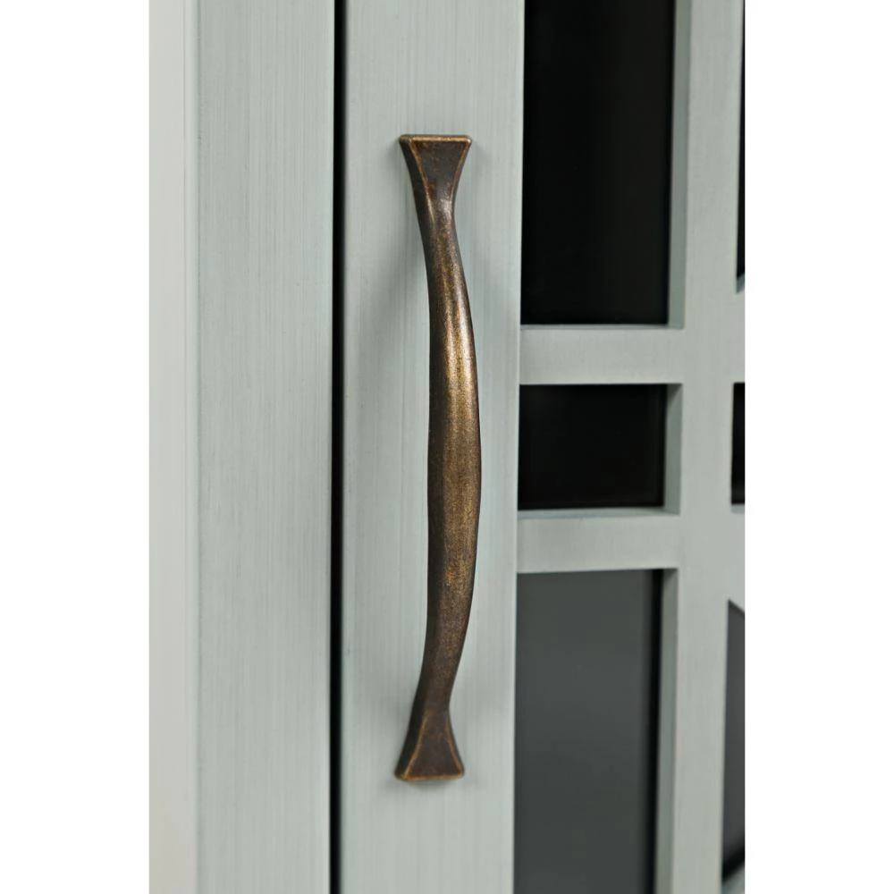 - Both drawer and door has antique hardware and “X” motif detailing over the glass doors