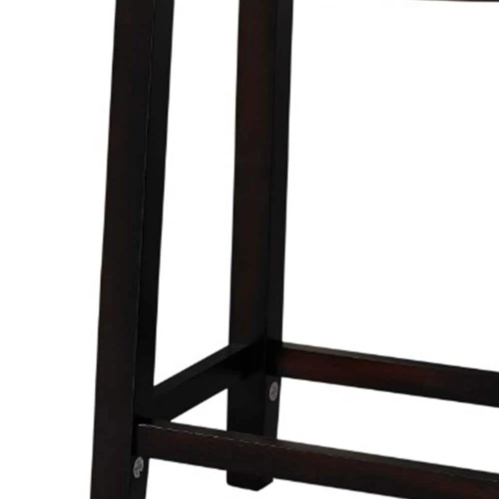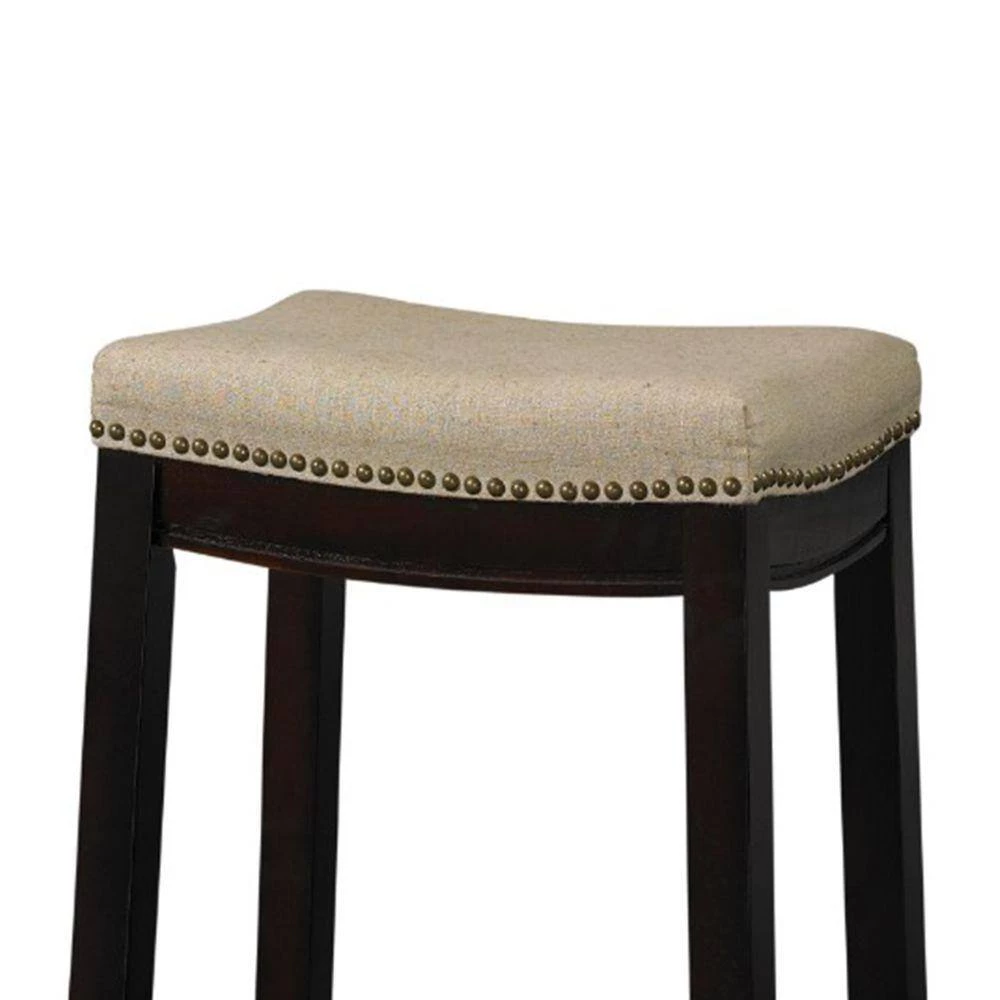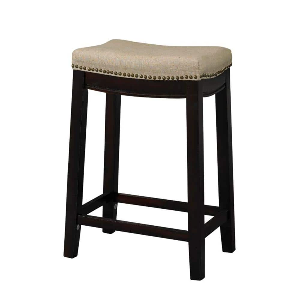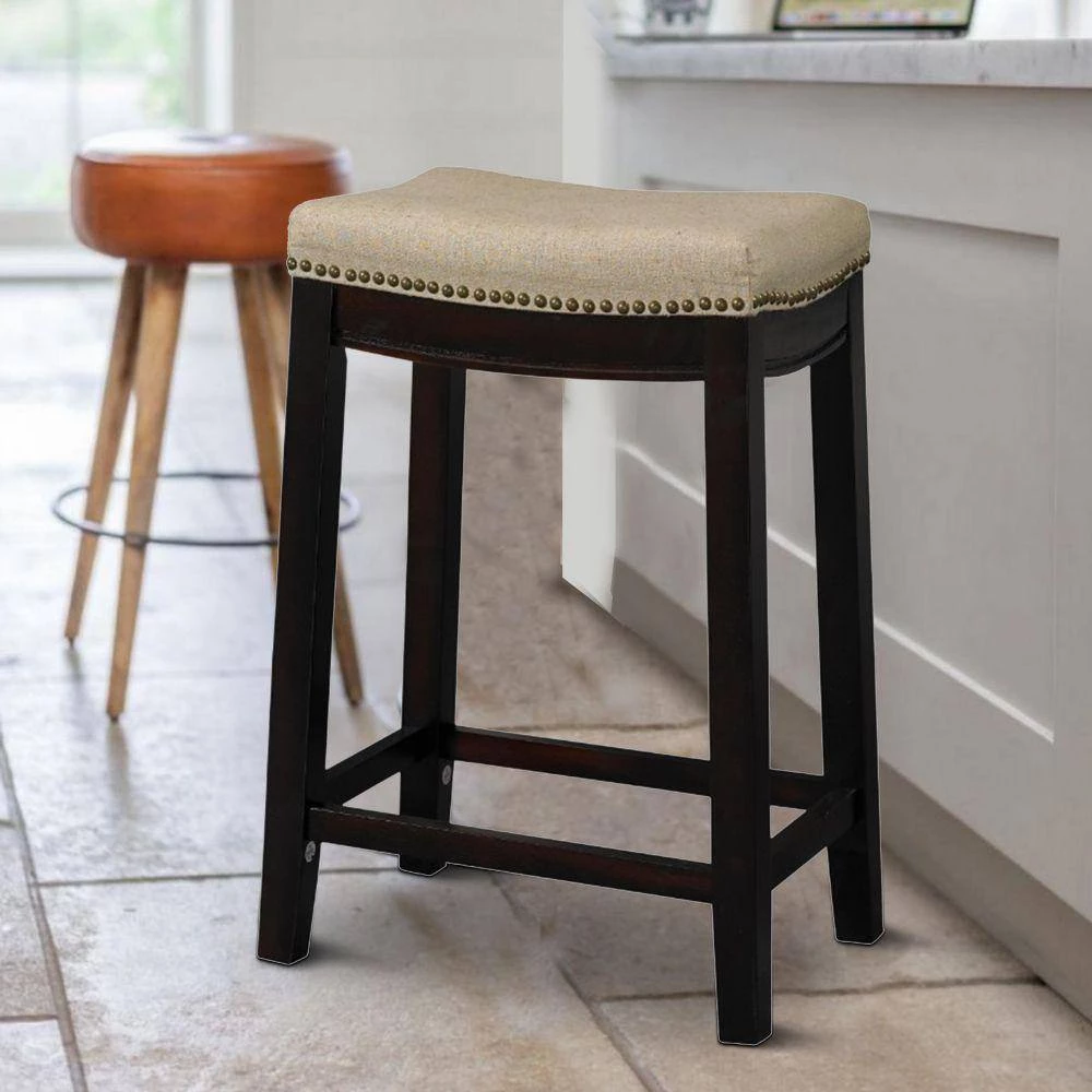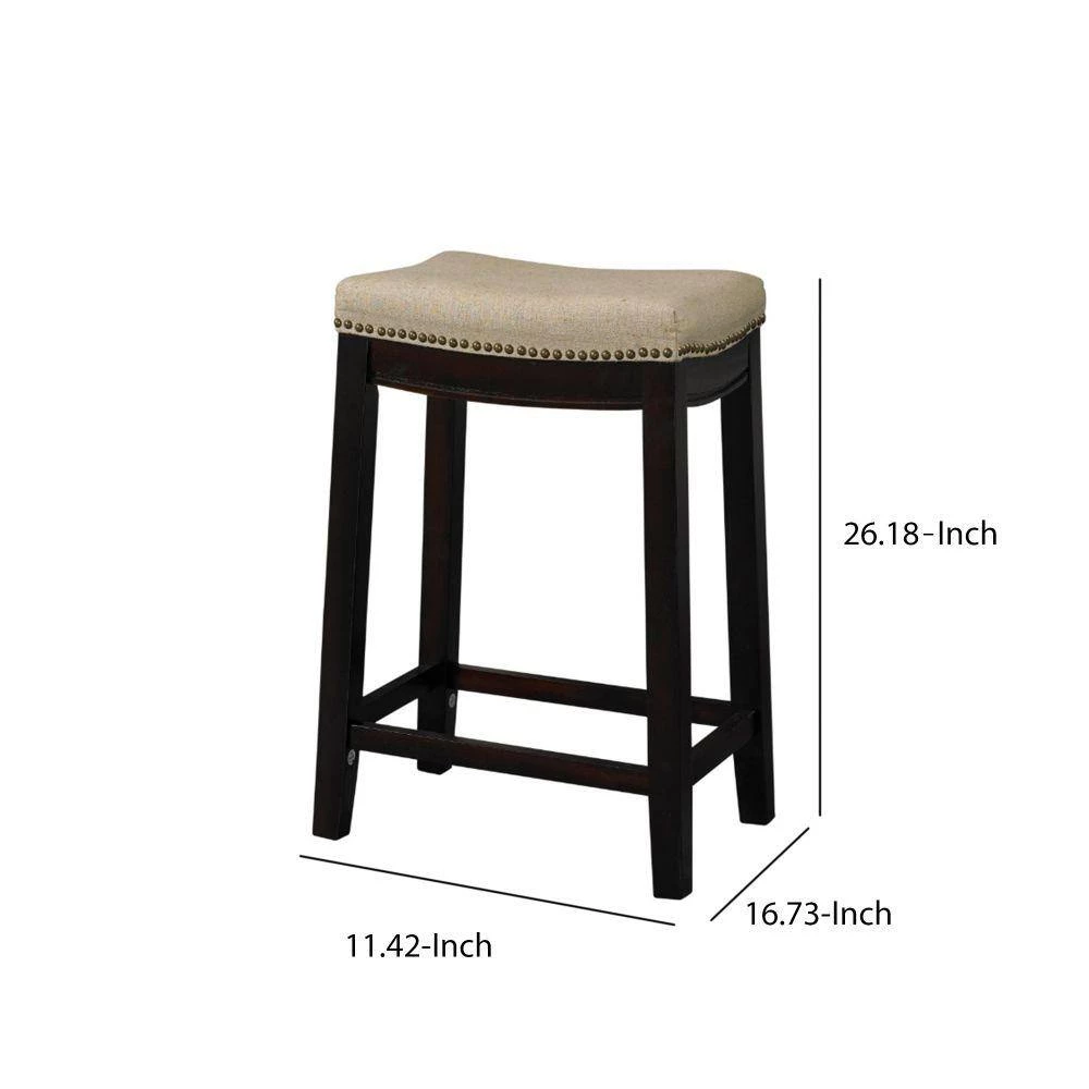 A perfect addition to your home bar or kitchen island, this counter stool is sure to enhance the beauty of your home decor with added comfort and style. Constructed sturdily with a combination of local hardwood, plywood, and foam, it features a cushioned seating, upholstered in beige fabric with nail head accents for a minimalistic look. Supported on wooden slanted legs, it comes in a dark walnut finish.