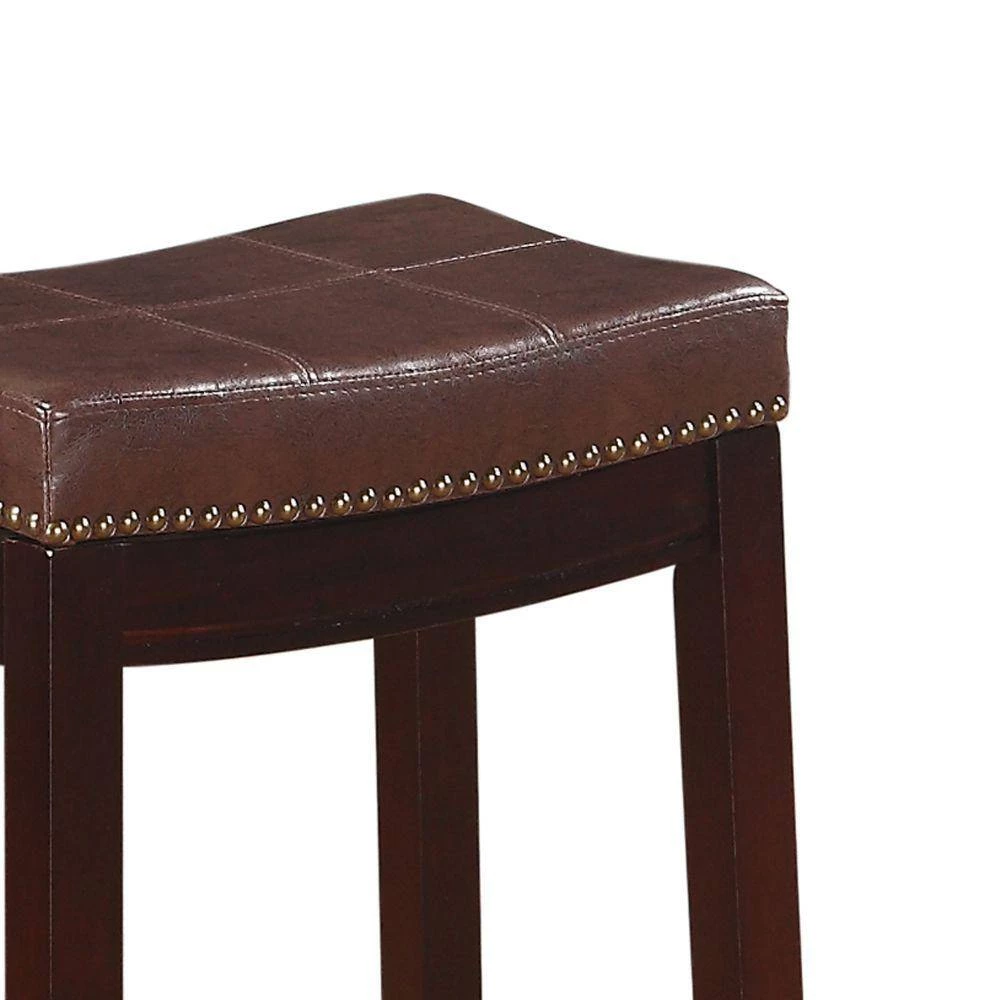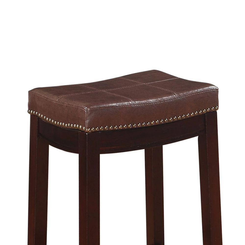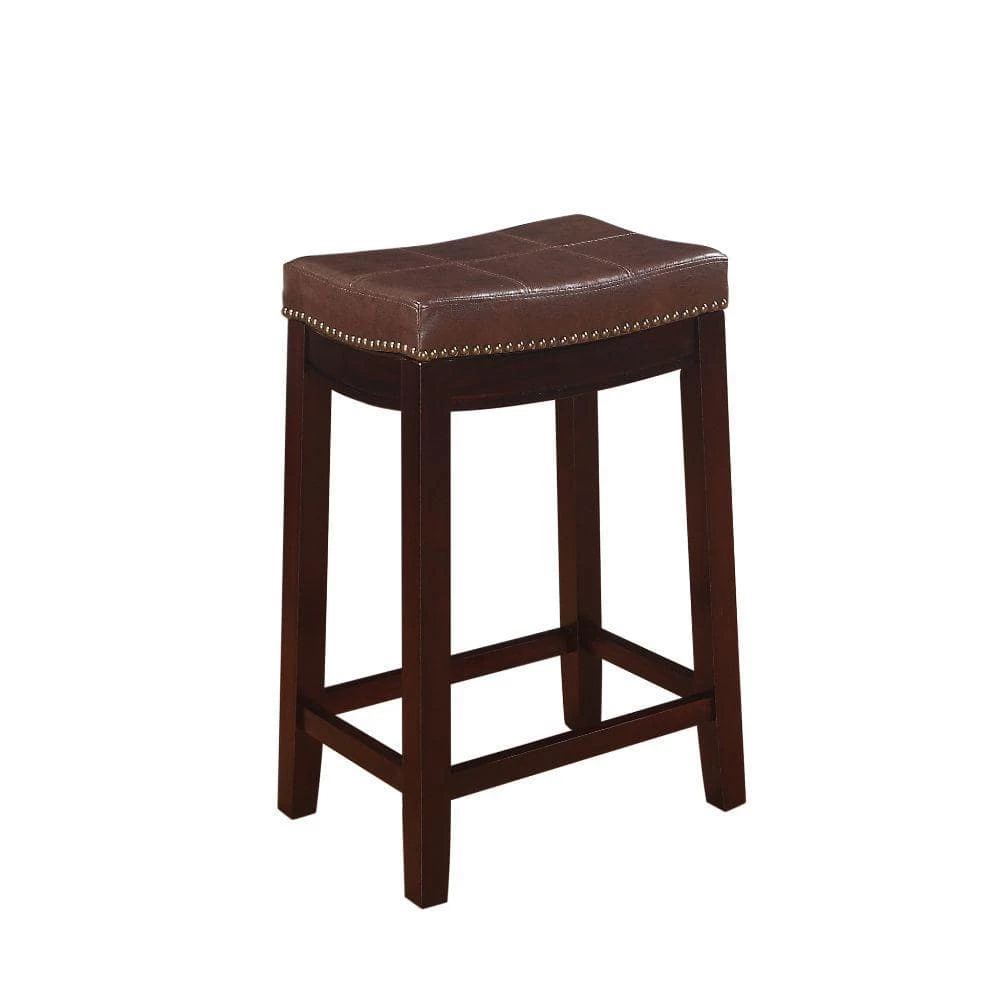 - Stool features a saddle seat supported on slanted legs with nail head trim accents