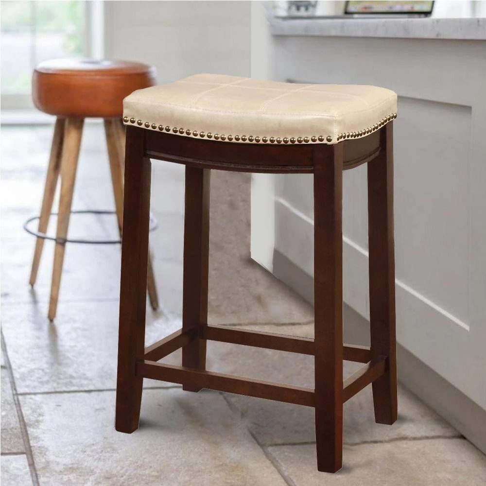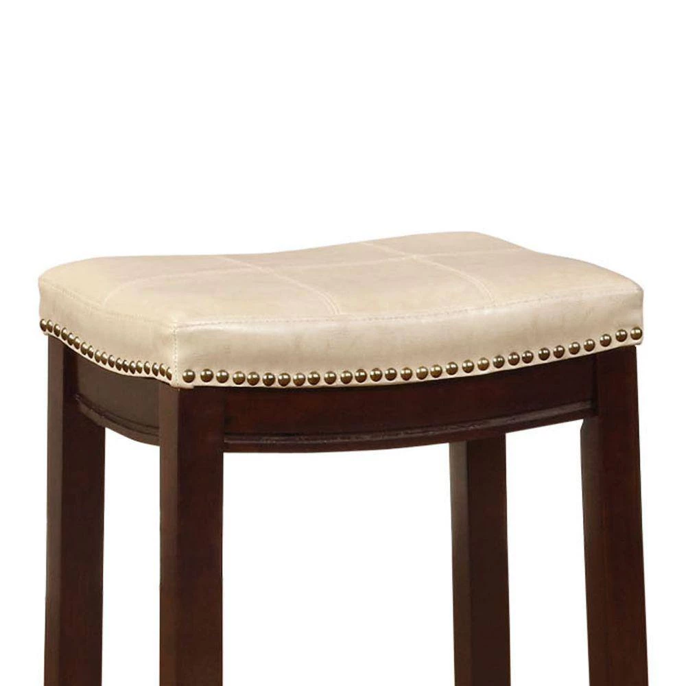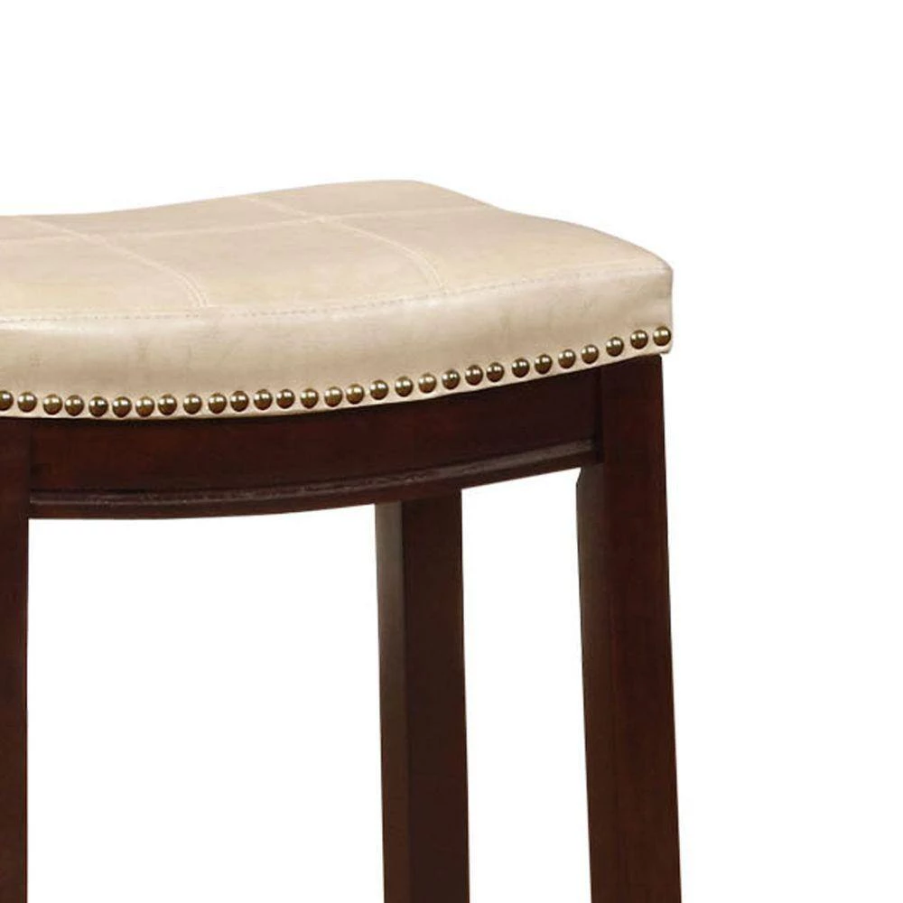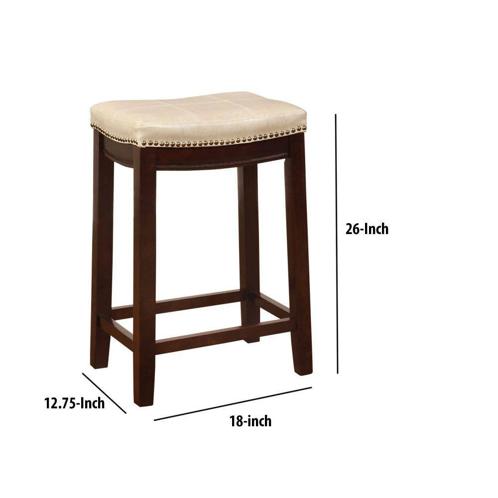 Transmute the look of your home with the addition of this counter stool which features a cushioned seat with cream faux leather upholstery and nail head trims accents, supported on slanted legs with footrest. It is made with a combination of rubberwood and solid wood in a brown finish. It will be a perfect addition to your bar counter or kitchen island to provide a comfortable seating experience.