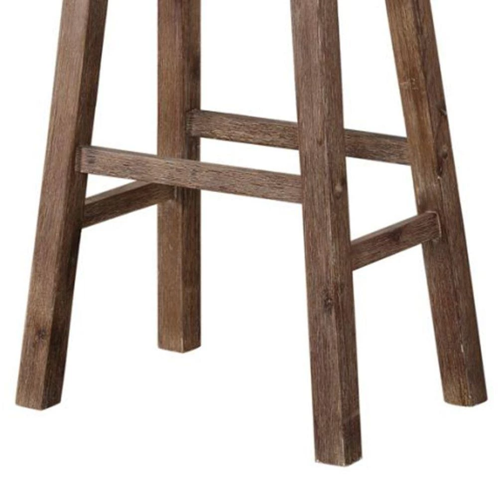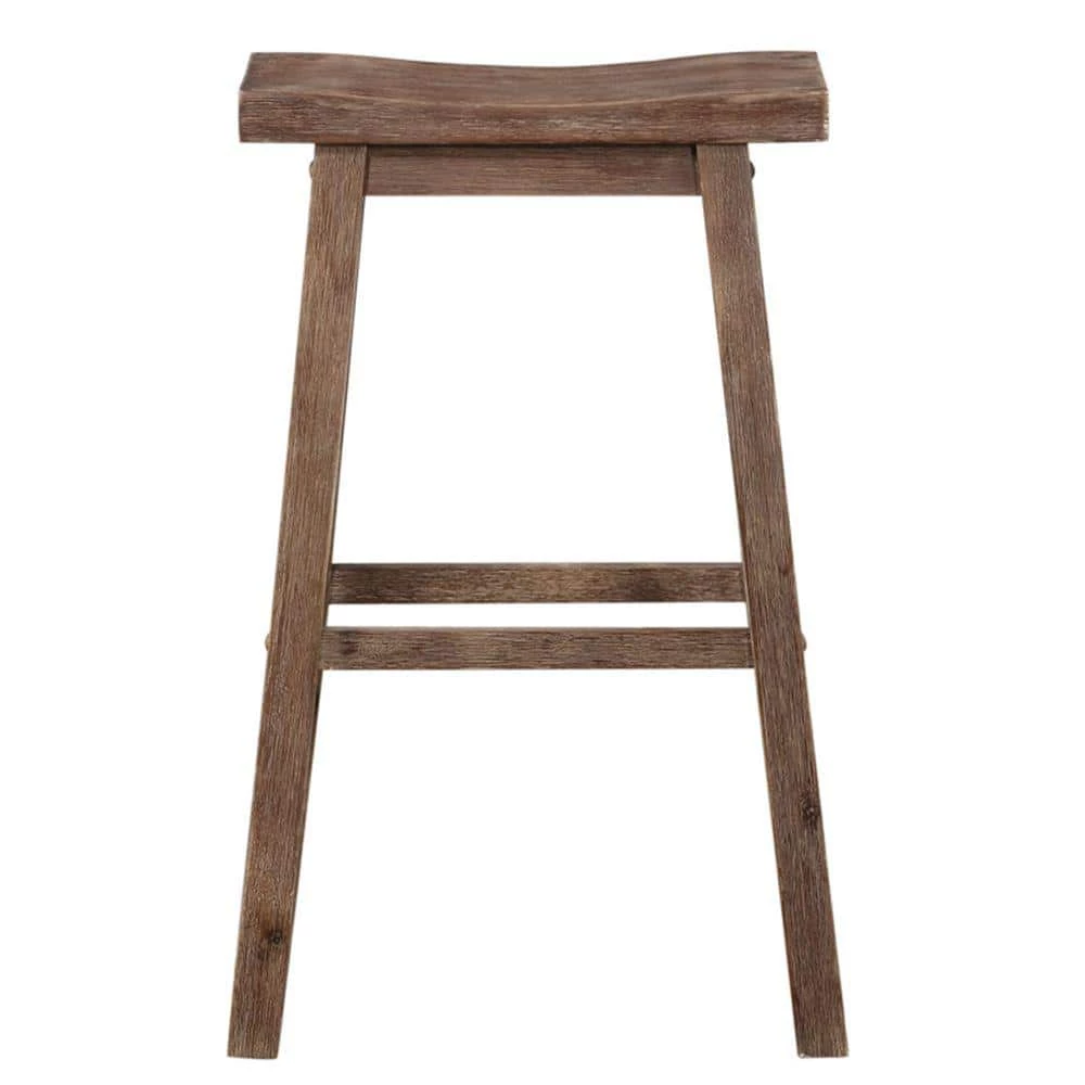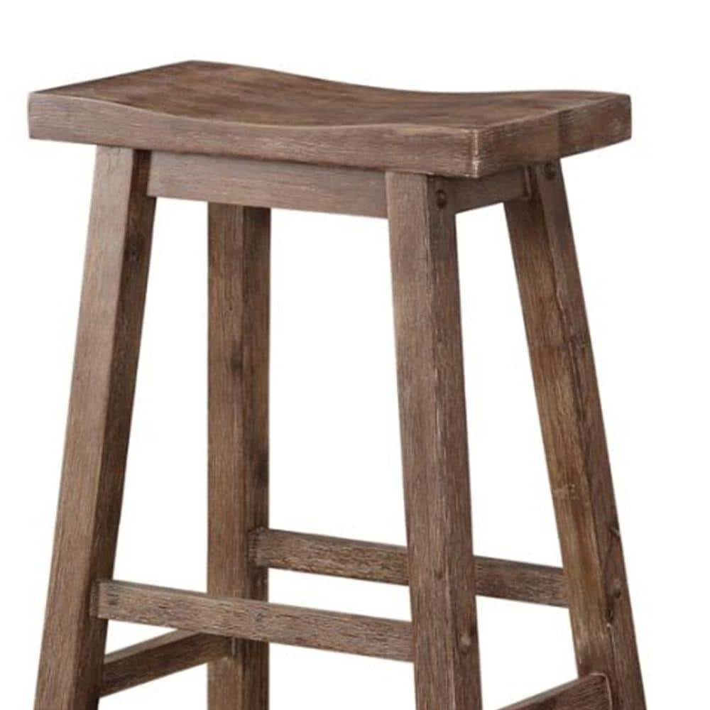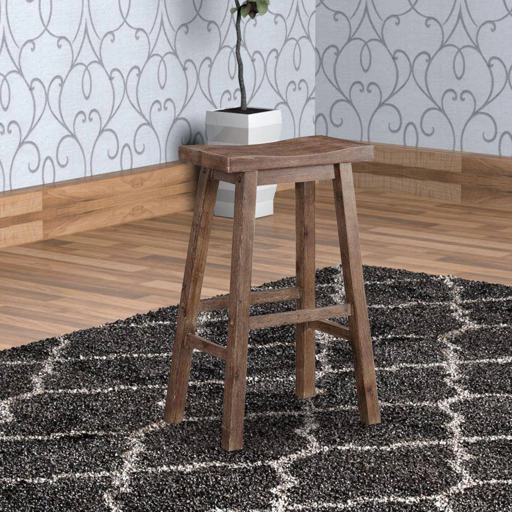 Add a casual seating to your bar space by bringing in this transitional style stool, featuring a saddle seat and showcases grain details. Constructed sturdily from solid hard wood, it is accented with gray wire brush finish. It will enhance the beauty of your space.