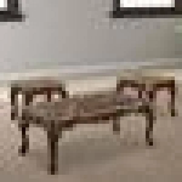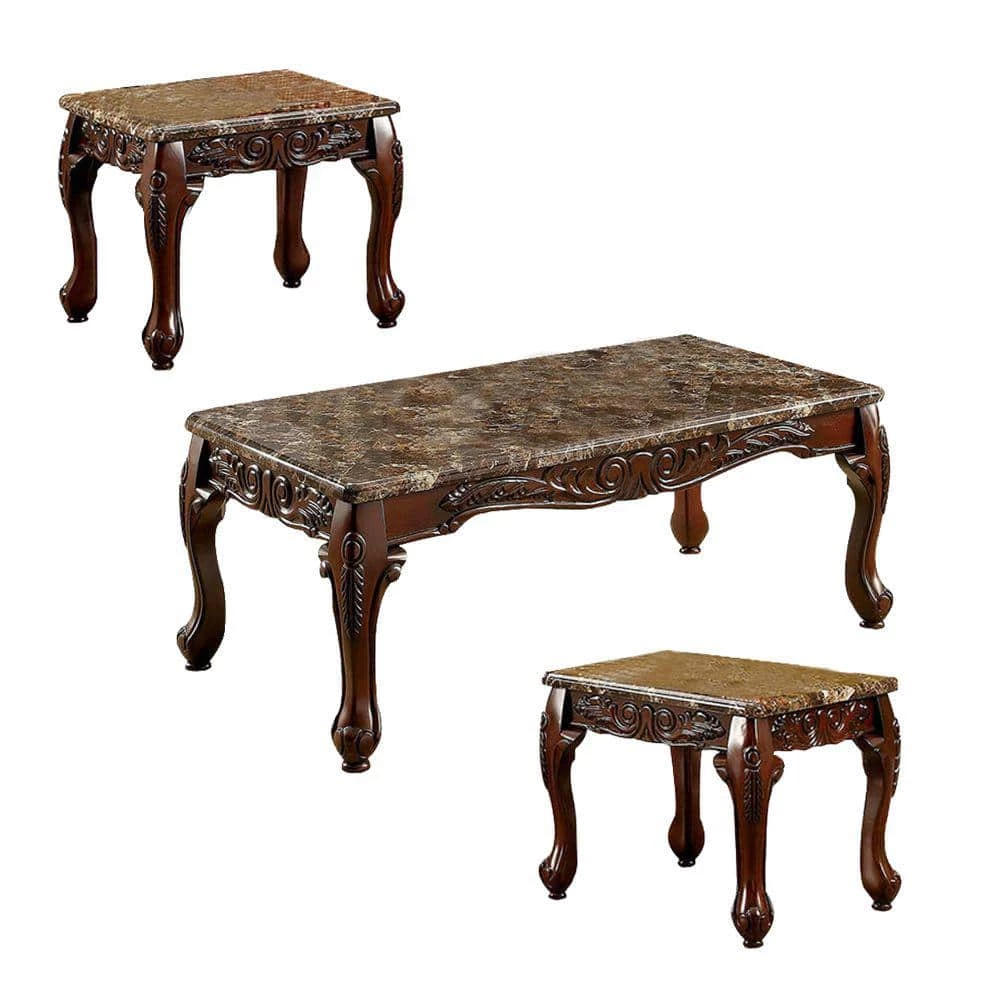 Charm your living room by adding this amazing pack of three tables, consisting of one coffee table and two end tables. Each table is designed with precision, featuring traditional design with elegant wooden carvings on the apron and scrolled legs. The smooth faux marble top offers easy cleaning while the marbleized texture accentuates its beauty. These wooden tables are polished in a rich dark oak brown finish that makes it blend with all dcor styles at ease.