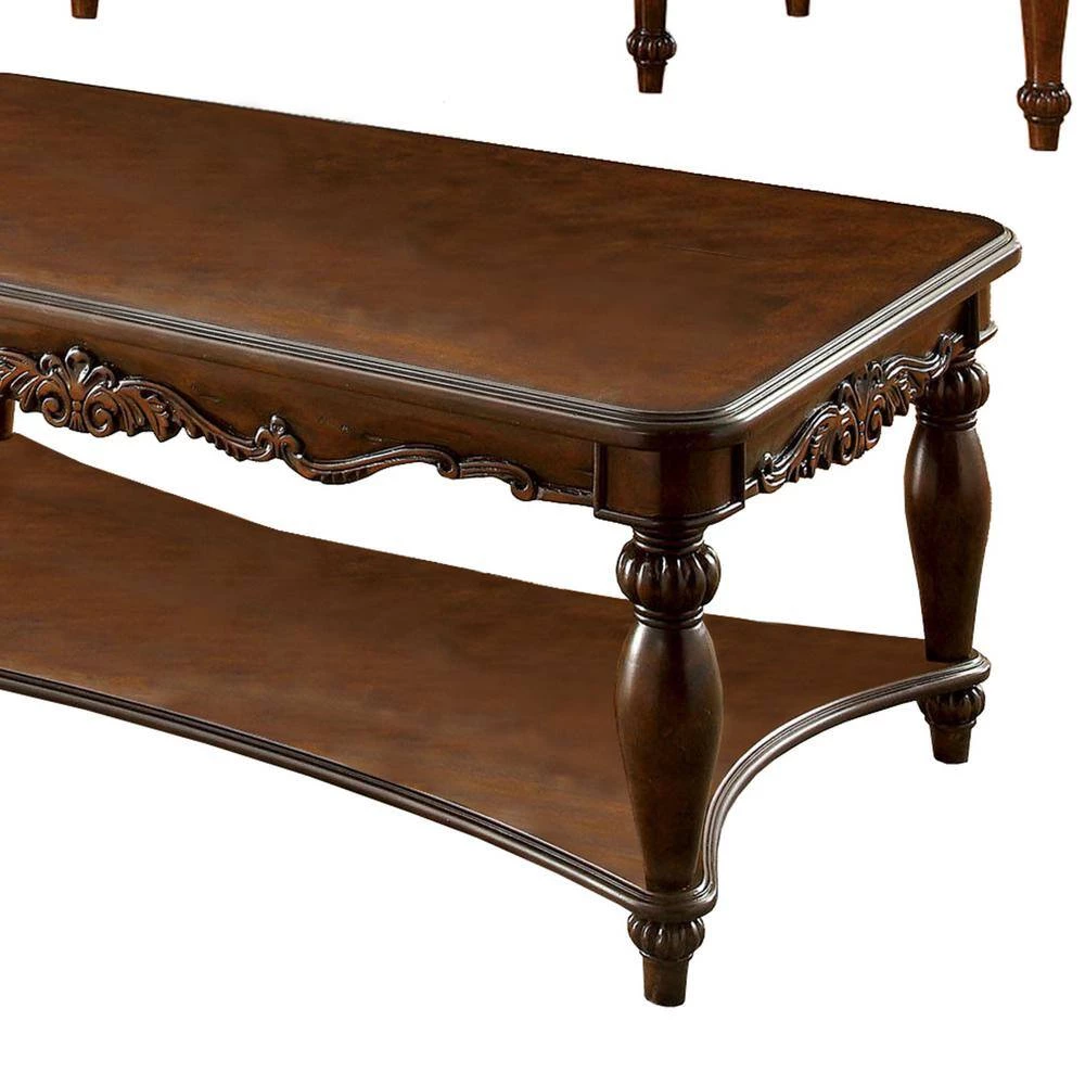 Crafted of manufactured wood and particle board, these coffee and 2 end tables offers a clean-lined silhouette with a sturdy and strong base which assures stability through its looks and a versatile solid finish. The burnish brown cherry finish and beveled speckled sleek top give this table an old-world appeal, while the elegant botanical carved detailing, and scrolling legs add an extra pop of artistic and ornate appeal.Does not include any product other than 1 coffee table and 2 end tables.
