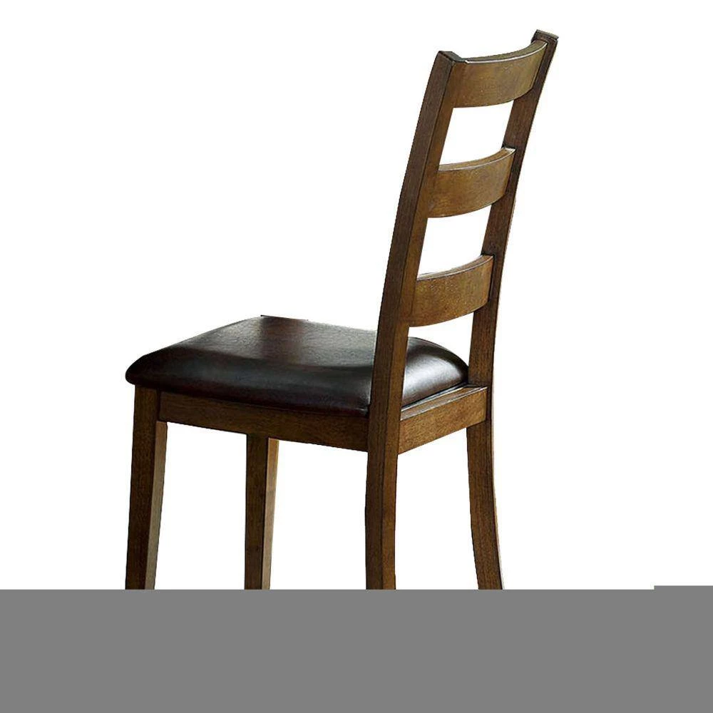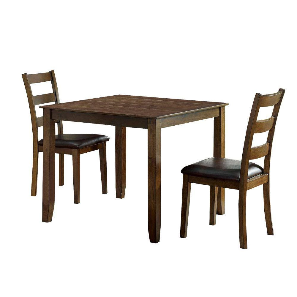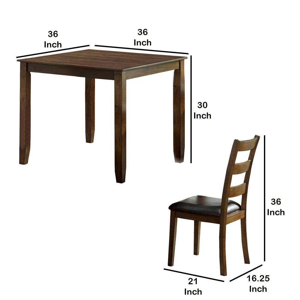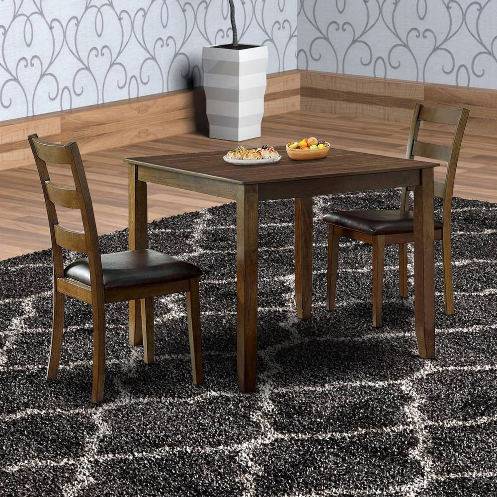 Embellish your dining space with this transitional 3 Piece Dining Table Set. Incorporating a desk with a square tabletop, showcasing grain details, it comes with 2 ladder back design matching chairs. The dark brown faux leather upholstered padded chairs offer the utmost comfort.