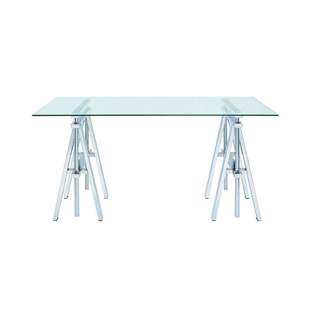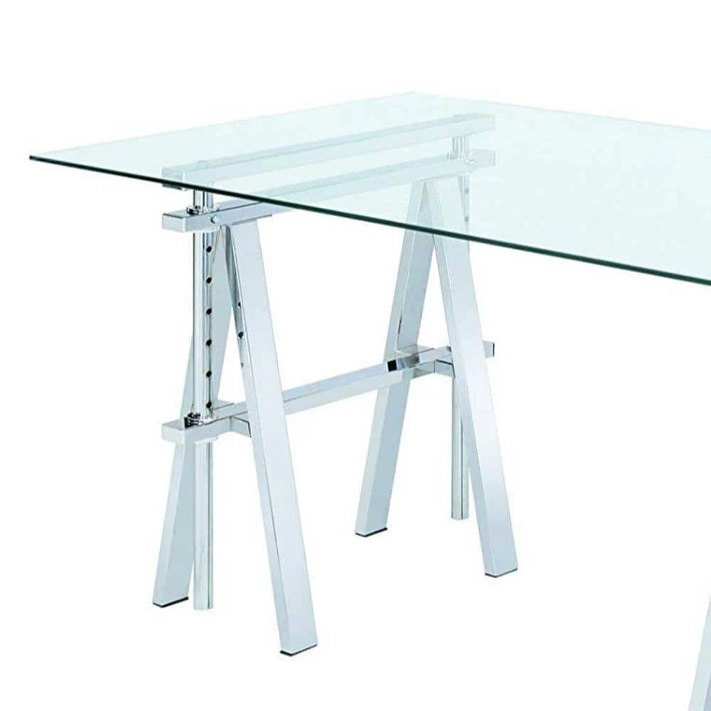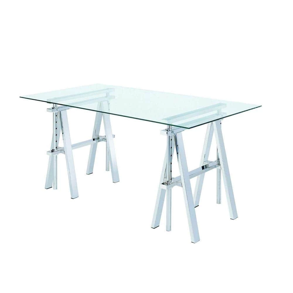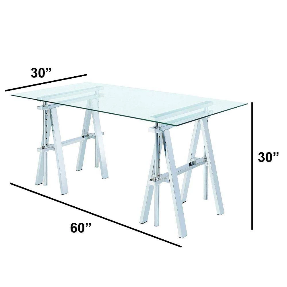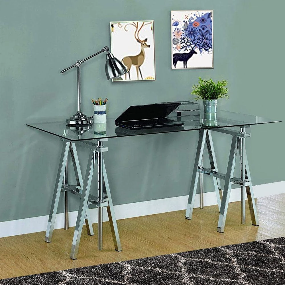 Your eyes will not know where to look with this sawhorse style chrome colored desk. It features a clear tempered glass tabletop and is capable of adjusting height in 2 in. segments. Built while keeping in mind the sleek lines of the decor. It is meant to provide that extra oomph to your furnishings and convert your home or office space into a dream.