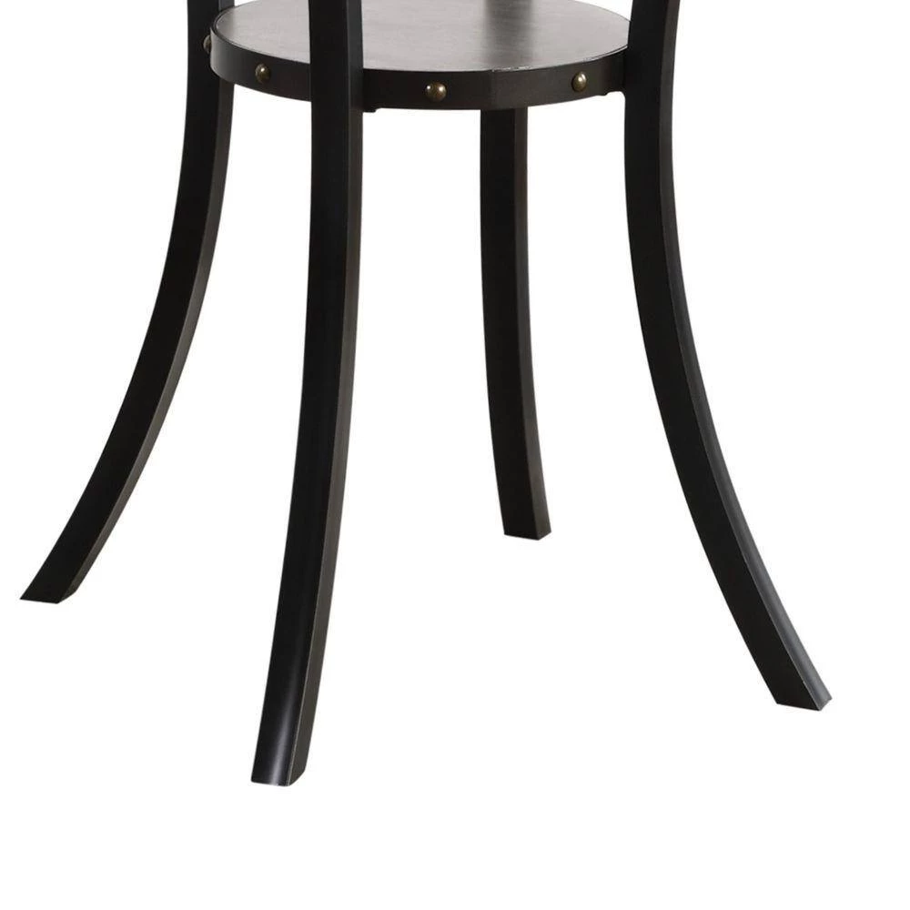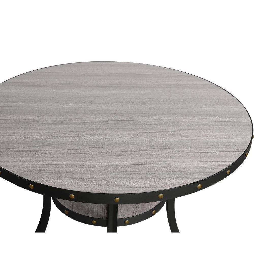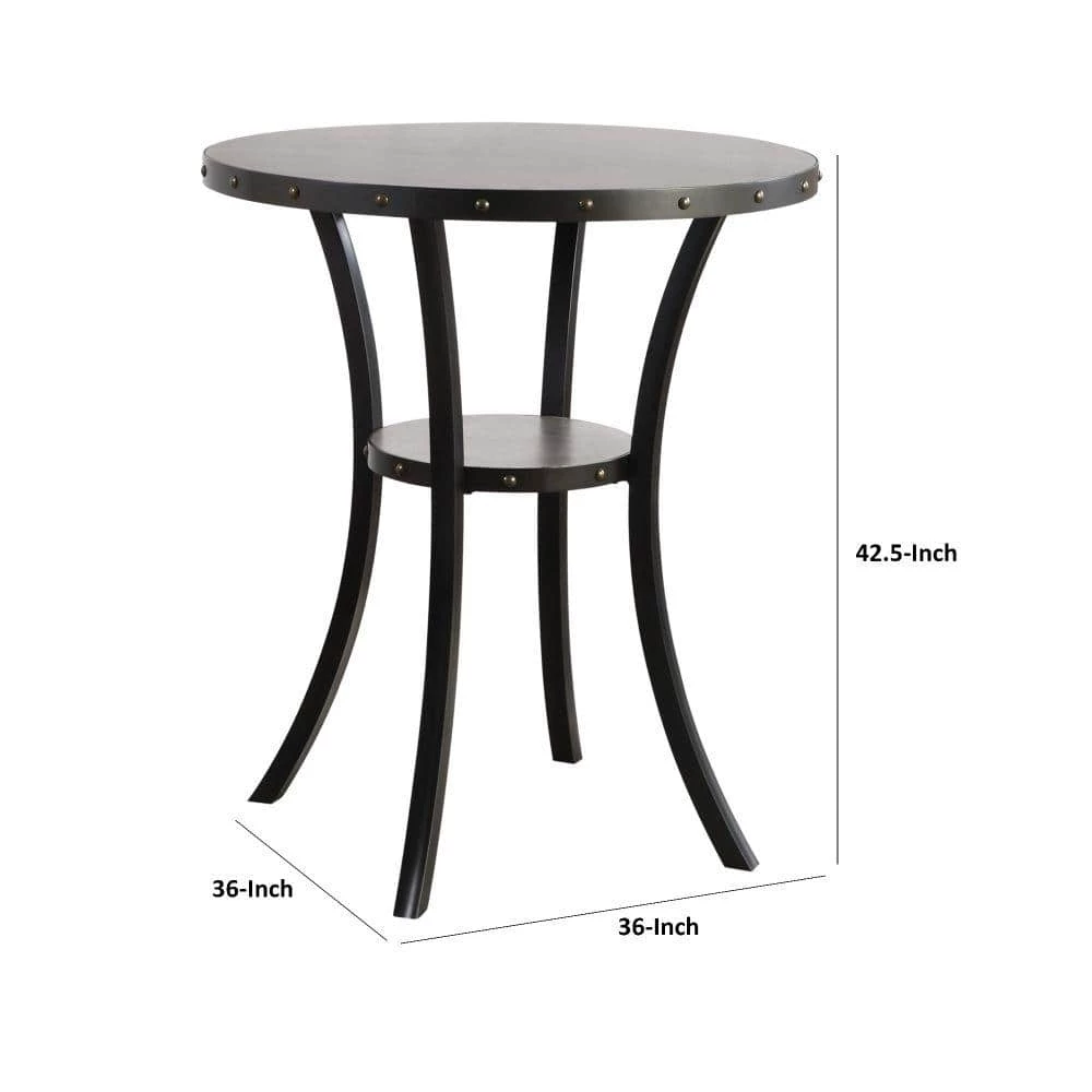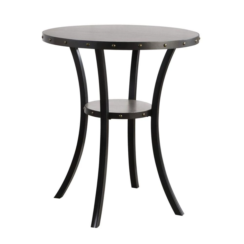 A bold statement for class and comfort, this 36 inch bar table features a smooth, gray, rounded wood top and an open bottom shelf for simple and classically integrated storage. Rivets accent the glossy, smooth interior and flared legs with a strong, industrial accent. Chairs sold separately.