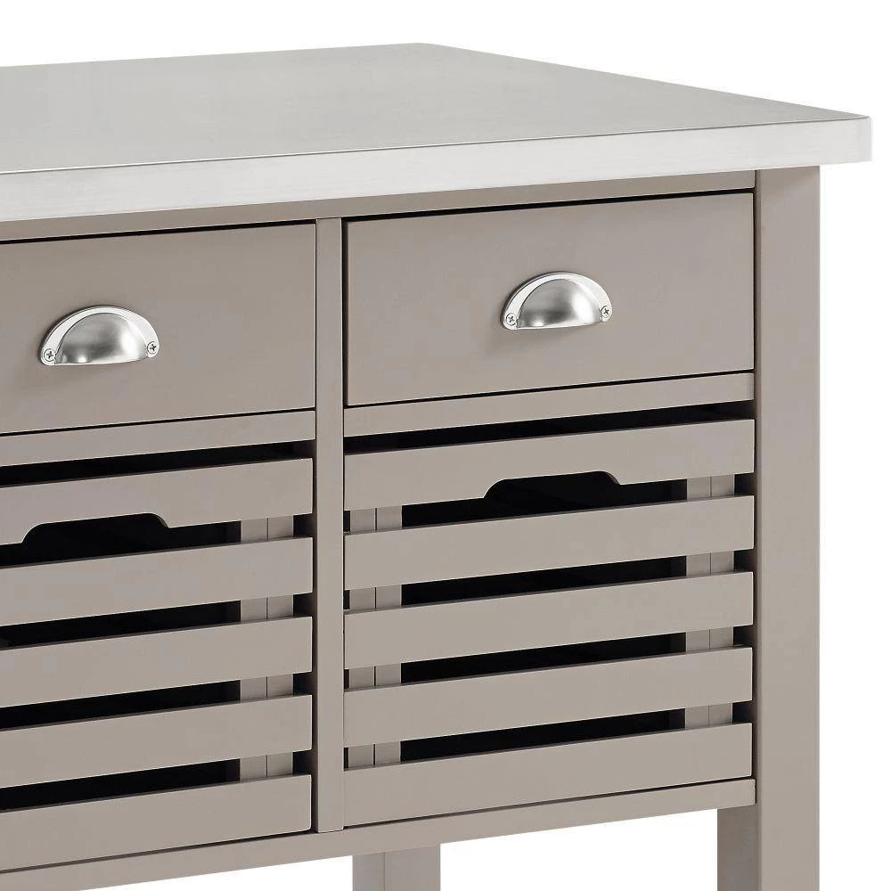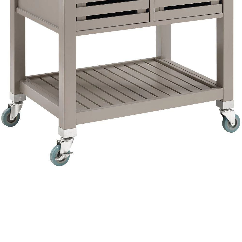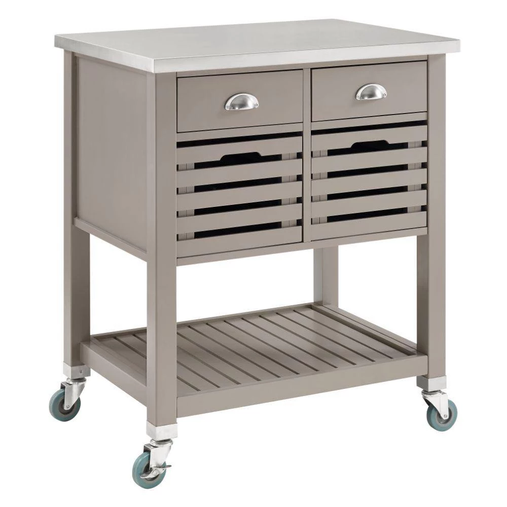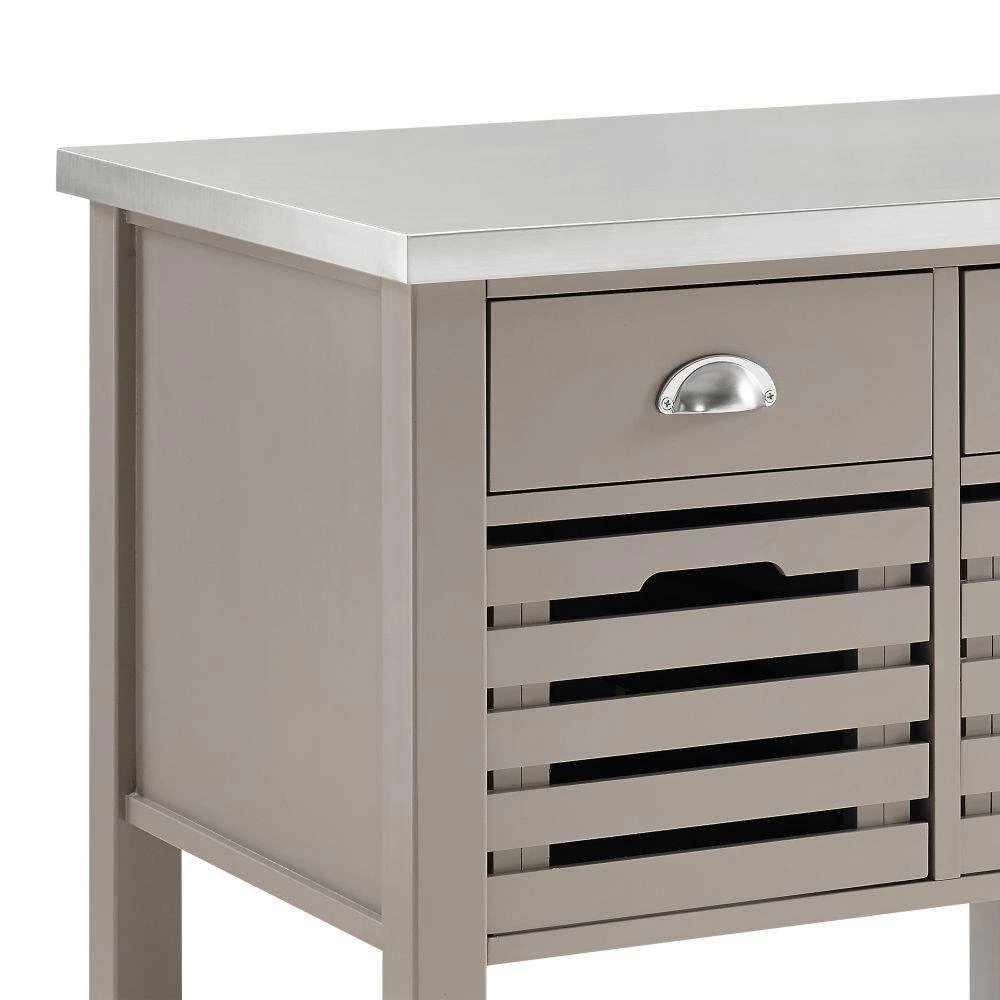 Add function and style with this kitchen cart which features 2 drawers with cup handles and 2 slatted drawers with handle cutouts. The open slatted bottom shelf allows easy access and comes with lockable caster wheels. It is made with a combination of MDF, Pinewood and particle board in a gray finish with a stainless steel top for prolonged durability. It will be a great addition to your kitchen and dining area for easy food serving.