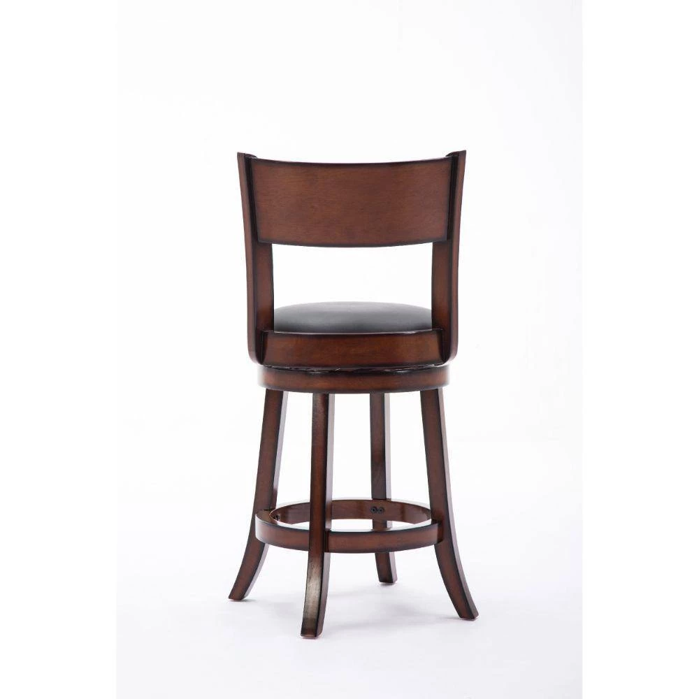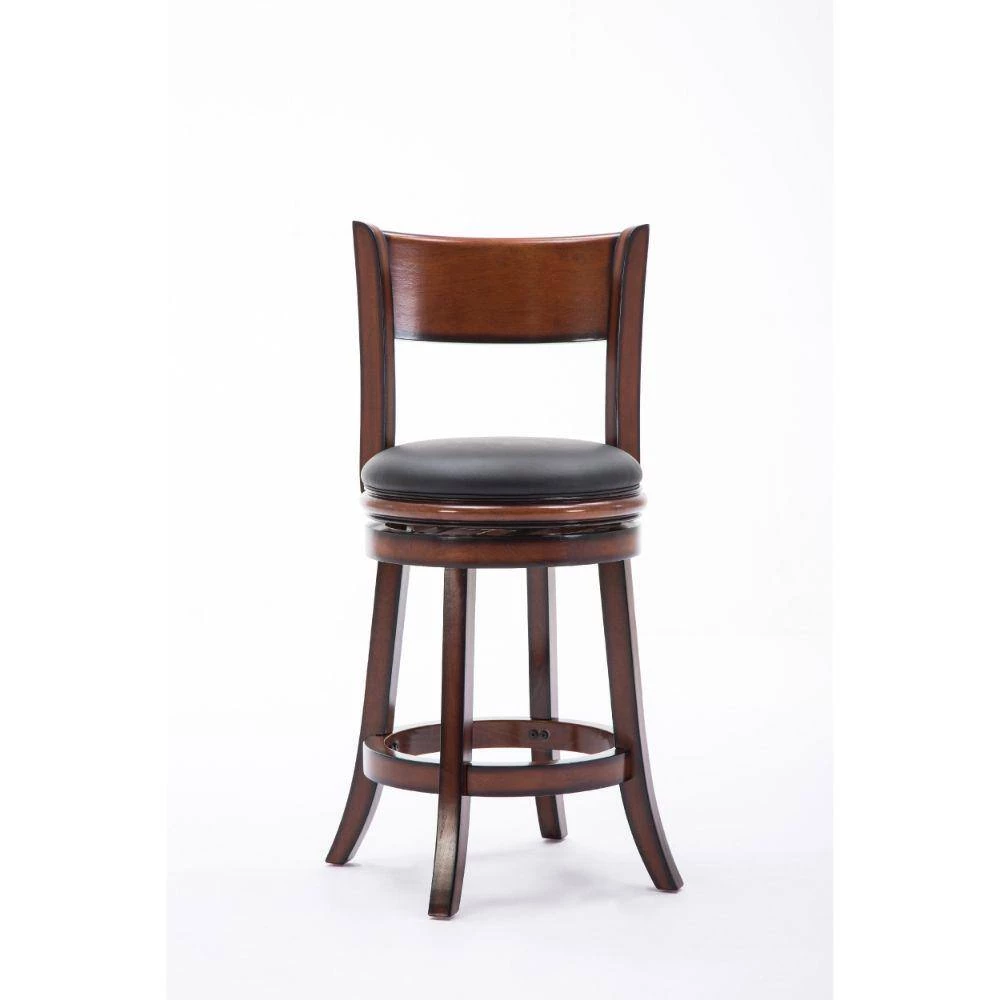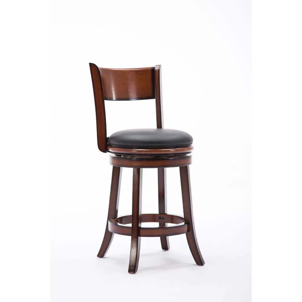 Classic and elegant, this counter stool brings a touch of added class to your modern decor and pairs both functionality and style. The curved panel back and a sleek, round, vegan faux leather upholstered cushioned seat with 360° swivel function brings a charming character to your kitchen or counter height dining room table. Check out our Pal collection for more.