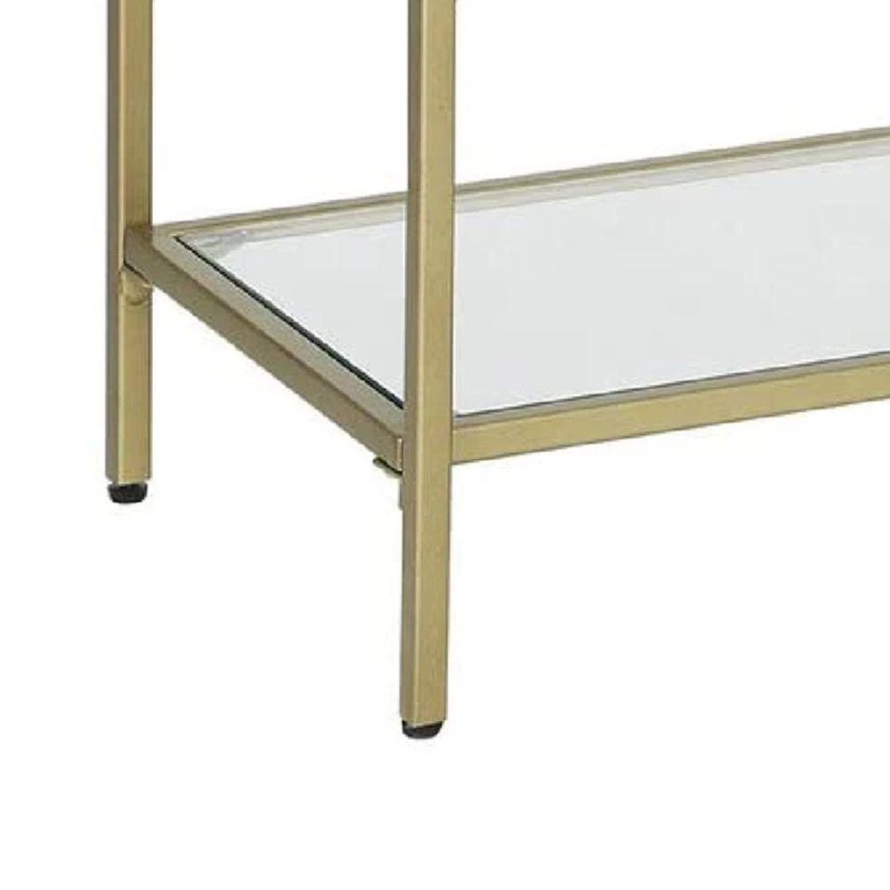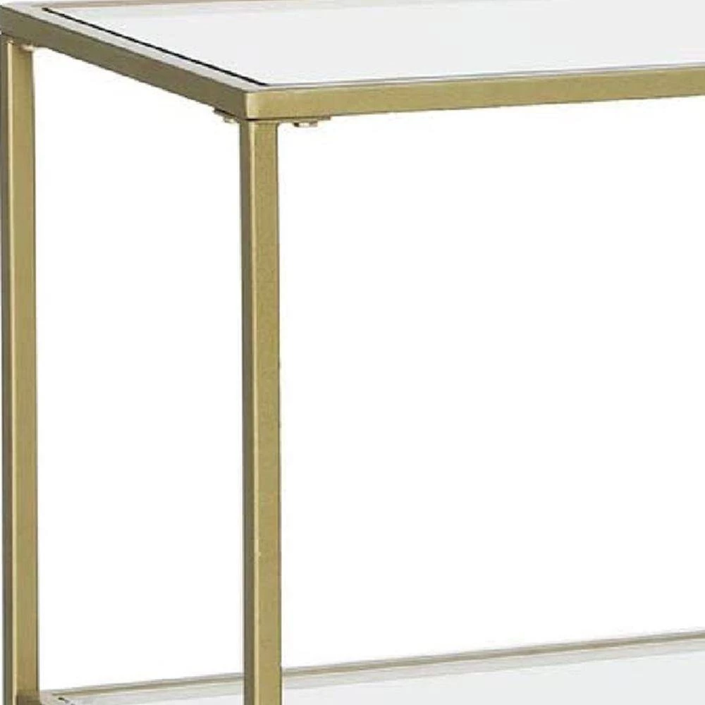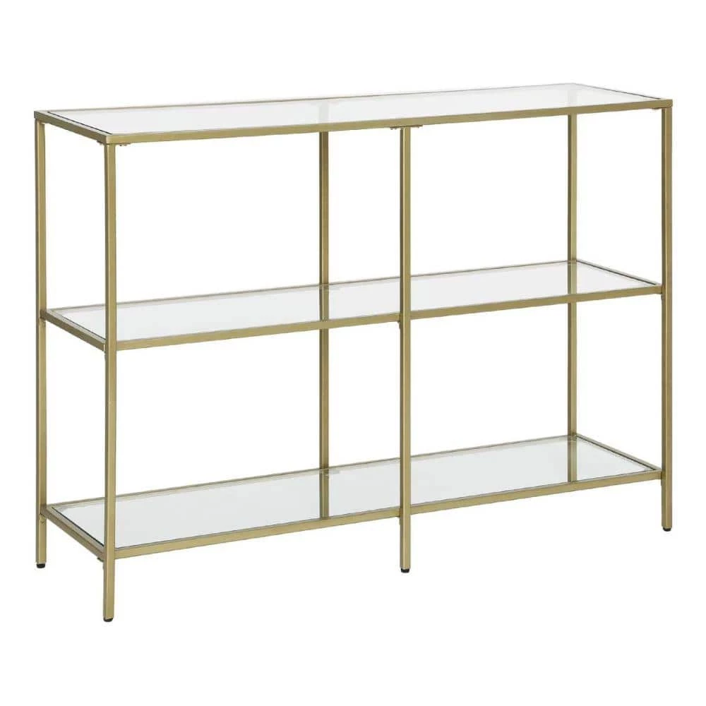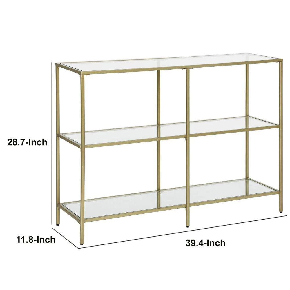 Enliven your living room or hallway with a modern, contemporary charm with this elegant console sofa table. The glass 3 tiered shelves are provided for keeping vases, decorations and hand curated items. The powder coated gold color metal frame makes it stunning stage for any style of decor. Check out more from our Kin collection.