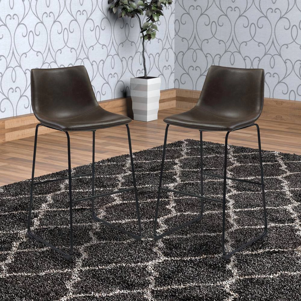 Bring the sophisticated look of leather seating to your kitchen, dining room, or entertainment area with these rustic contoured counter height stools. With its distinctive contoured bucket seat and tubular metal base, these stools serves up a fresh twist on mid-century inspired style. These stools has a clean design finished in brown leather. The base of these stools features footrest for convenience. What a timeless look for eat-in kitchens and casually cool dining rooms.