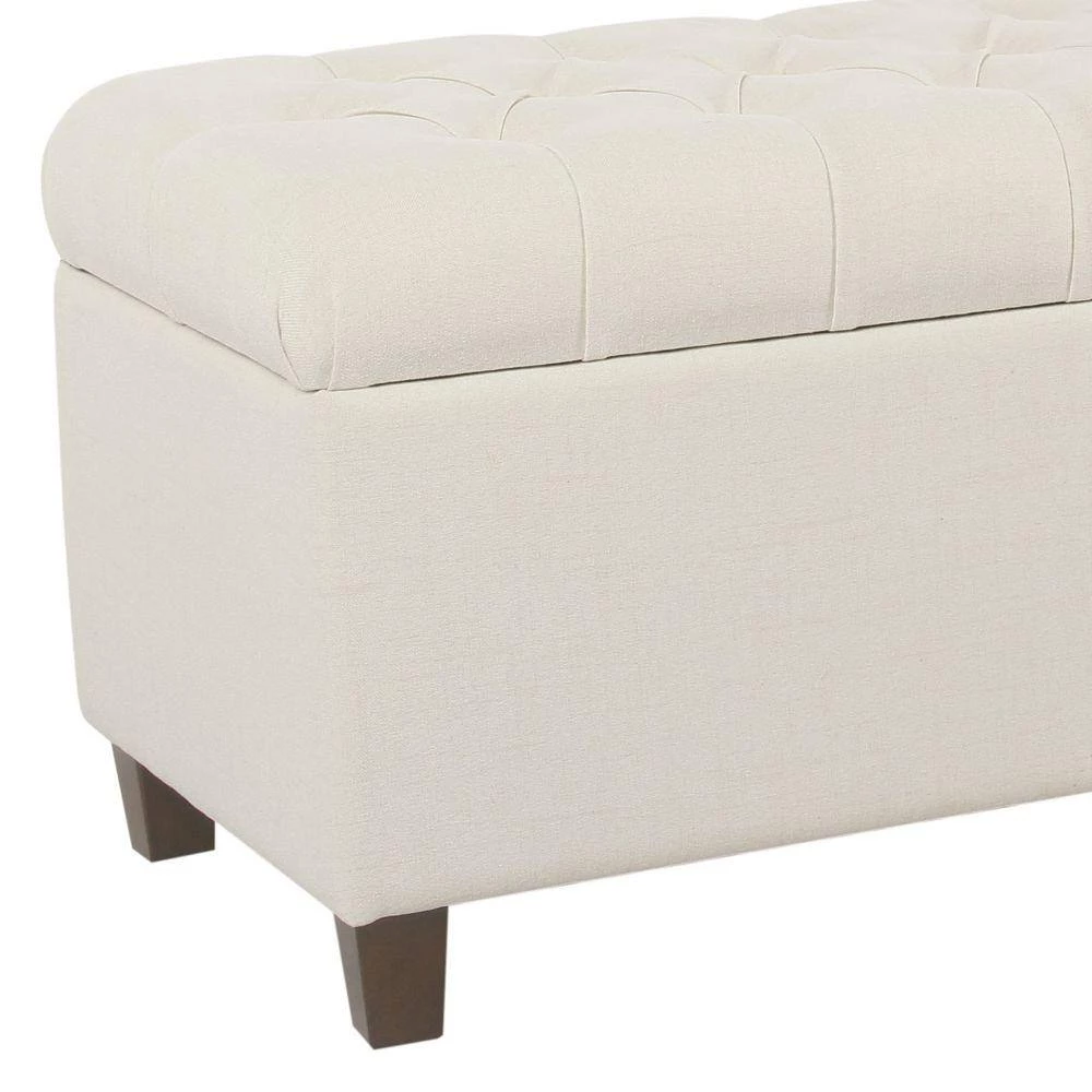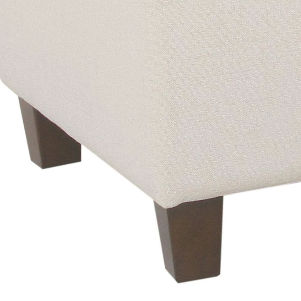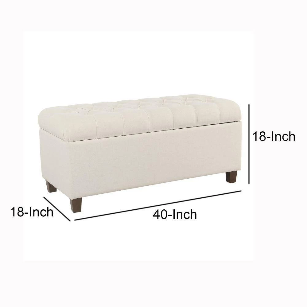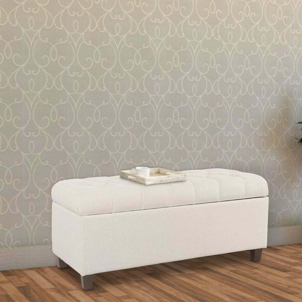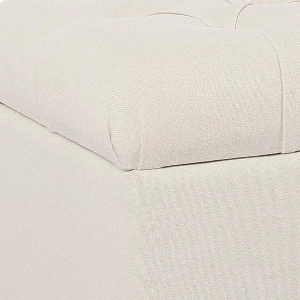 A deliberately designed upholstered bench will add a flair of style and contemporary storage to hide extra commodities in your living room. Constructed from plywood and wood with soft textured white color polyester fabric upholstery, this bench features hinged lid storage and button tufted detailing, giving it a unified design. Use it as an entryway bench, bedroom bench or you can also place it in your home office to offer extra seating. Tapered wooden feet in dark walnut brown finish, giving greatest support and sturdiness to its design.