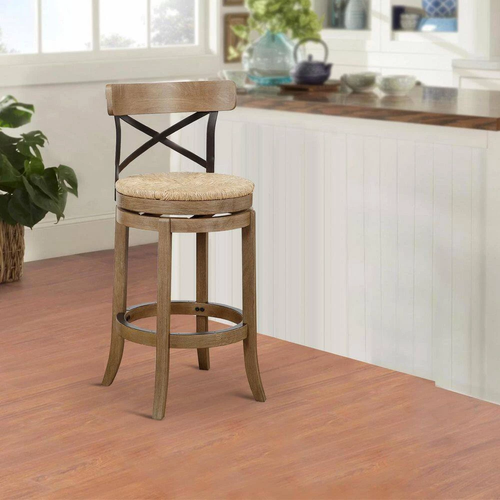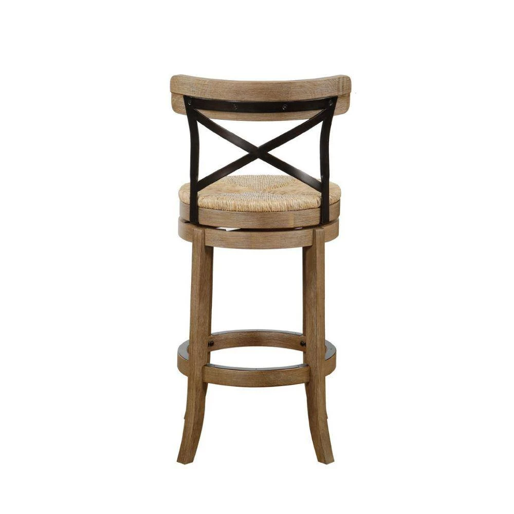 A unique blend of style and sophistication, this swivel barstool from our Mia collection adds a striking flair to your countertop dining area. Crafted with solid rubberwood frame with a wire brush finish, a woven sedge seat, metal cross back, double seat apron, round stability stretcher footrest and sturdy flared legs. This stool is a marvel of both beauty and practicality.
