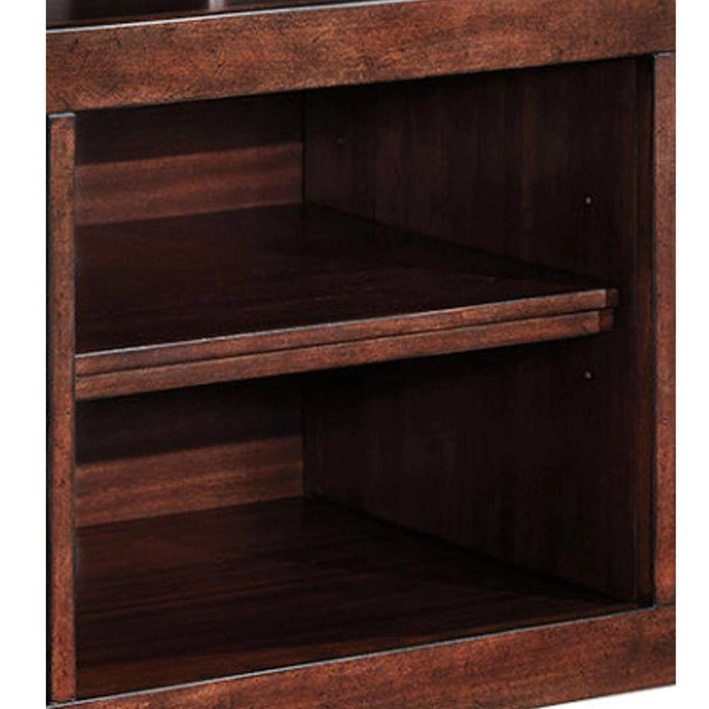 - Features two open cubbies and an adjustable shelf and side door cabinets
