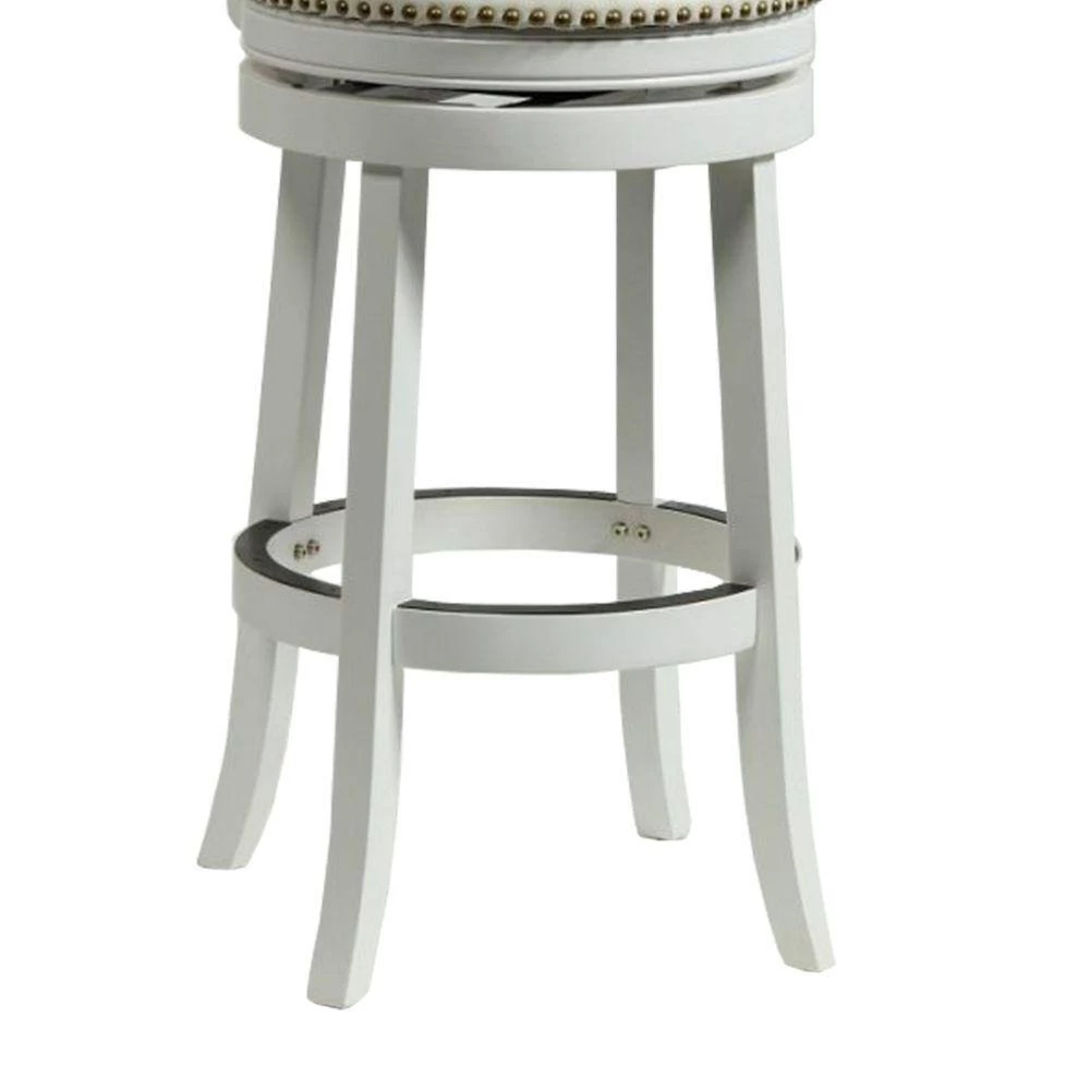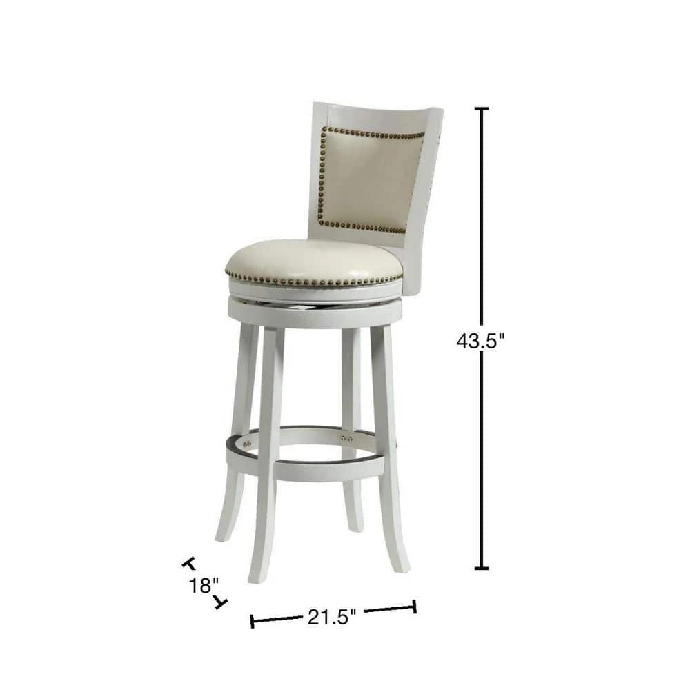 Add a casual seating to your bar space by bringing in this transitional style Bar Stool, featuring a round padded seat and curved cushioned backrest with brass nailheads trim. Constructed sturdily from hardwood, it is upholstered with white color faux leather. It will enhance the look of your space.
