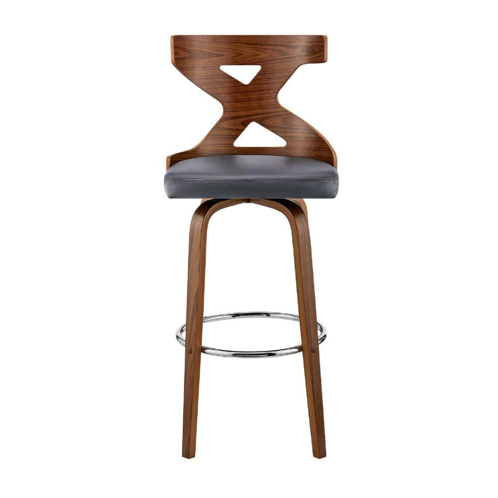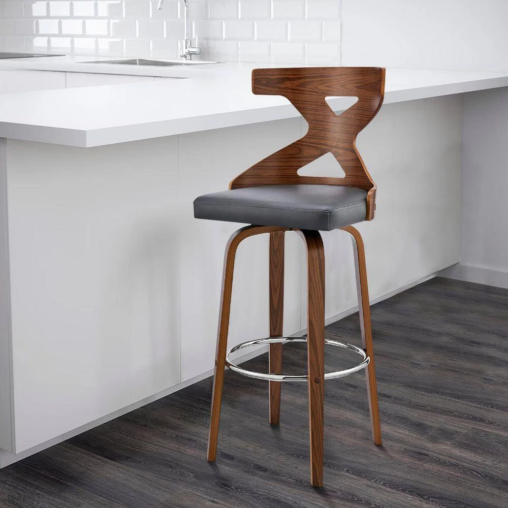 Offer instant style to your home decor. This barstool is made from walnut wood in a natural finish featuring faux leather upholstery and filled with foam for the just right amount of support whereas the X shaped curved design back adds considerable visual interest to the seating. The 360° swivel function allows for maximum mobility and allows you to change the position with ease.