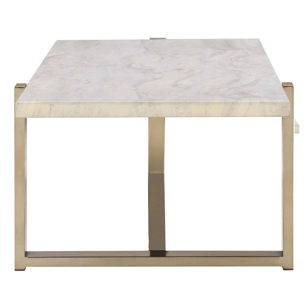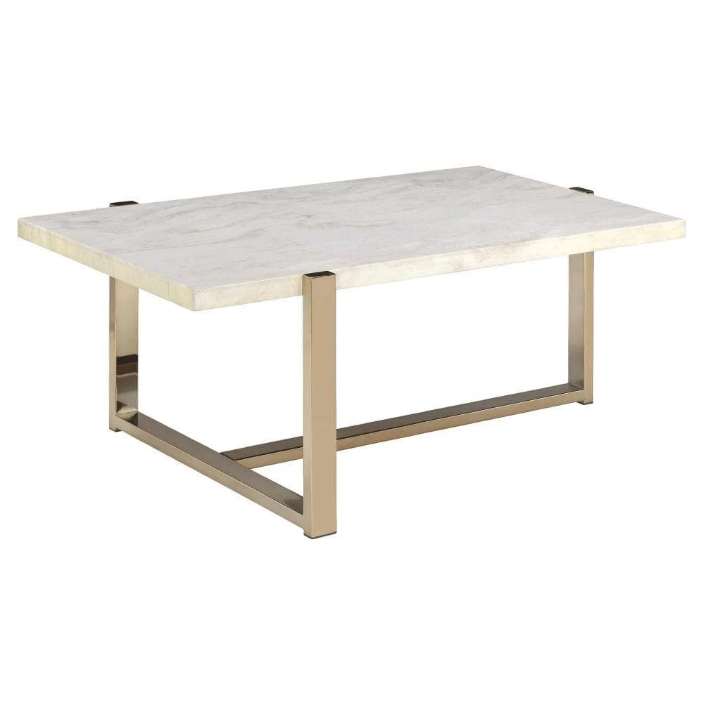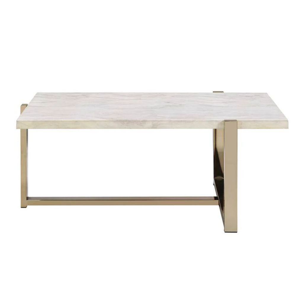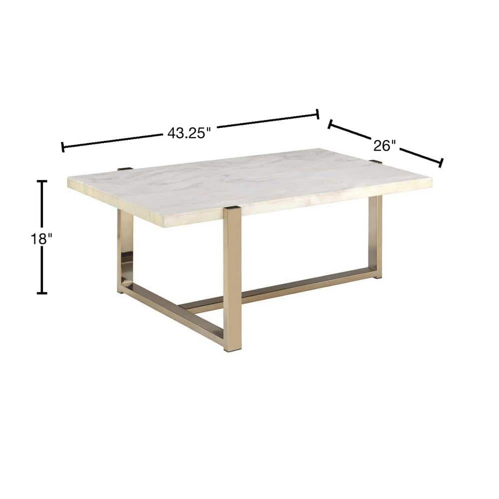 Add a sophisticated touch to your living space with this remarkably designed coffee table with open metal base that offers a great strength. Inspired from modern design, this coffee table has a sturdy engineered wood top with a faux marble appeal in white finish, making a great contrast with the golden base. The smooth finish offers you easy cleaning while the top can be used for decorative display and serving.