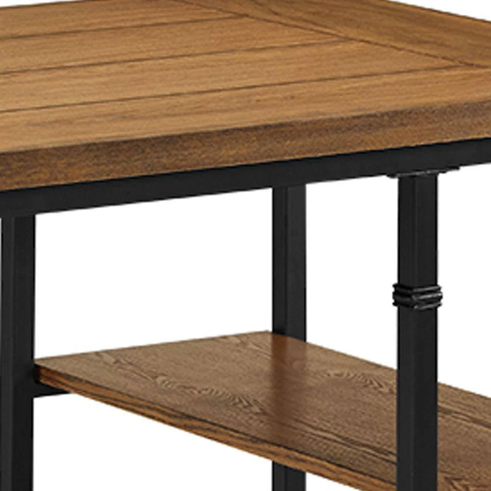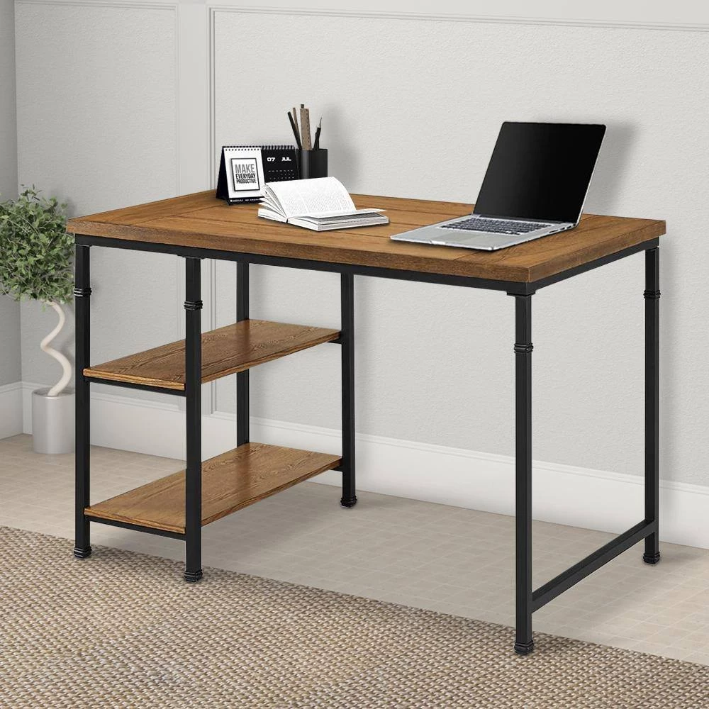 This industrial design working desk has a contemporary look that will blend easily into any theme home and office decor. Sturdily made using MDF wood, particle board, veneer in a brown color finish and black color metal legs. It has a spacious plank finish top and two open shelves for storing a variety of work essentials, books, magazines and displaying art objects. The sturdy legs are giving strength and will be ideal for home and office use.