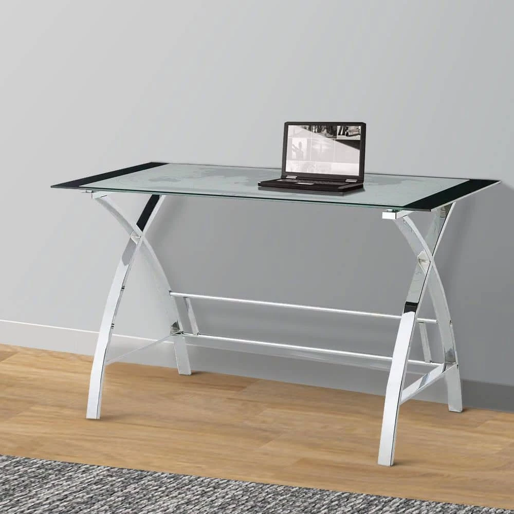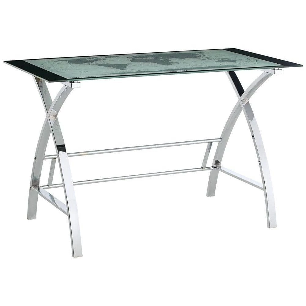 The World Map Computer Desk is the perfect addition to any office or work area. Crafted from strong chrome plated metal and durable glass, the top features a beautiful map design while the sides feature a unique X-pattern. Providing ample workspace and design features like no other, this piece is sure to become a conversation starter. Some assembly required.