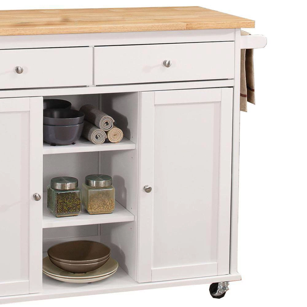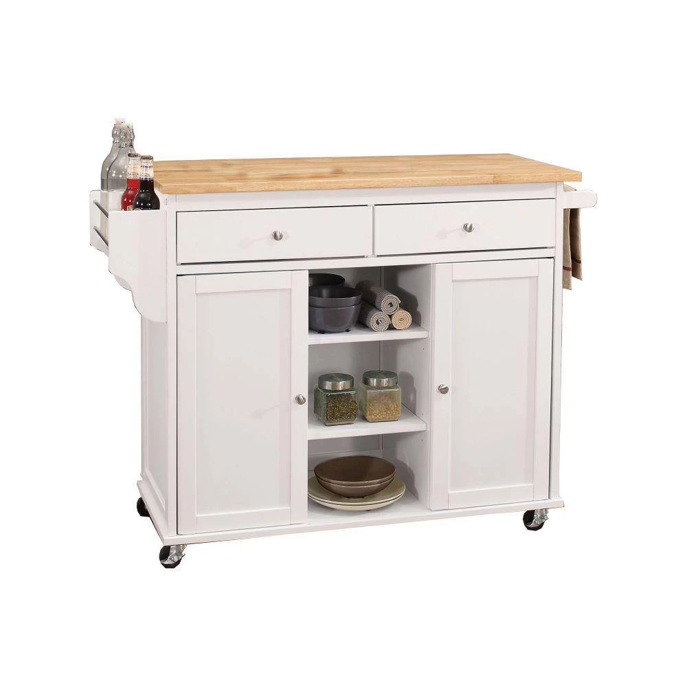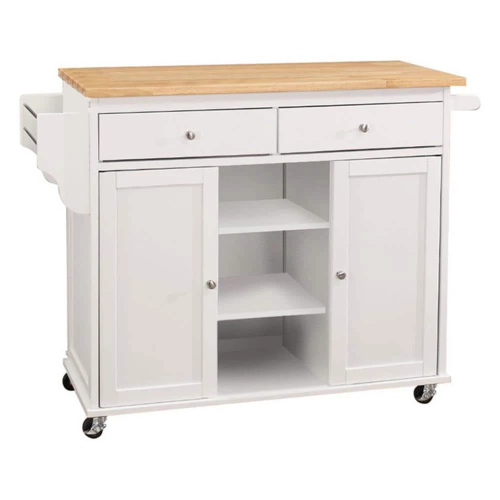 This kitchen cart is a very efficient and functional piece to include in a kitchen interior. This kitchen cart features 2-door each with 1-shelf inside, 2-drawers, 3-open storage compartments, and wooden top. Its 4-caster wheels (2-with locks) make this cart for friendly to use. This cart has separate spice and towel rack.