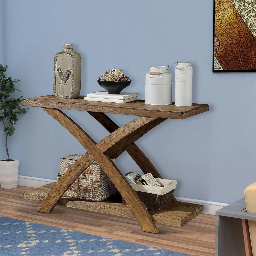 Elevate your transitional ensemble with the inclusion of this Sofa table. It features a rectangular top and open shelf to display your favorite decorative with the angled X shaped base adding a refined touch to your decor. The overall distressed finish gives an utterly charming effect, this functional table will surely be the highlight of any room.