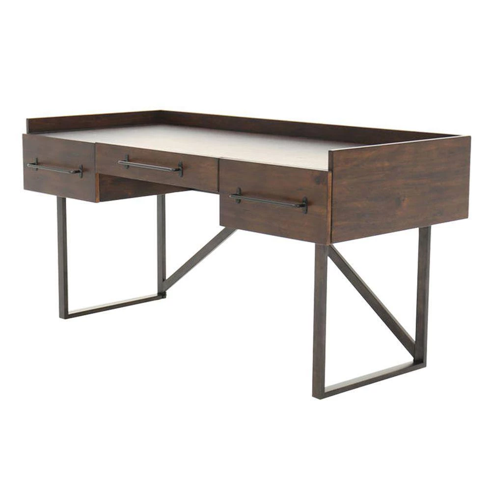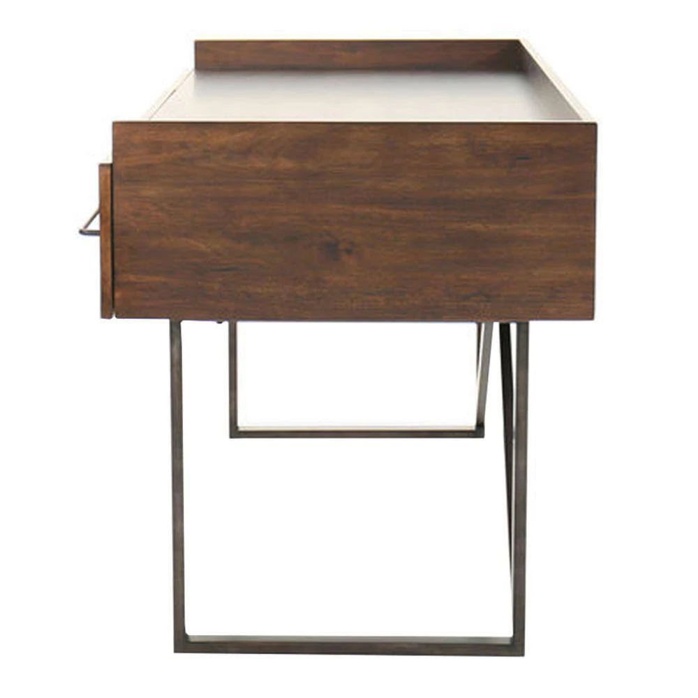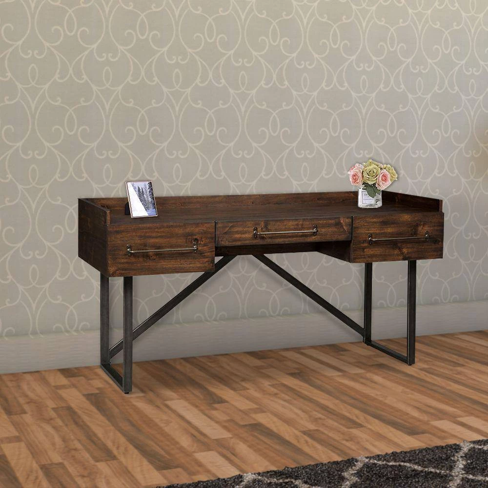 Upgrade your home or office decor with this writing desk, made from acacia veneers and engineered wood. It features walnut brown finished top and black finish tubular metal legs for an appealing look as well to have good support base. The smooth top of the desk is ideal to display picture frames or table accent items. It also has three spacious drawers for storing all your office supplies and keep the top clutter free. It can be used as a writing or working desk for your home office.