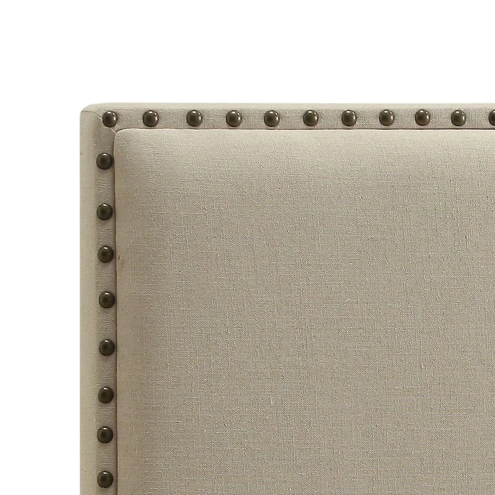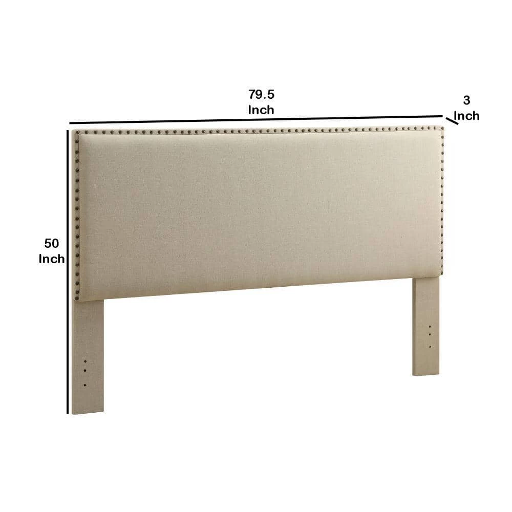 This King size headboard has simple and smooth design that will perfectly stylize any theme bedroom interior. Made up of solid wood frame and draped with fabric upholstery, this headboard also features a nail head detailing on its side, giving it a unique look. Incorporating a beige finish with contrasting bronze nail heads, it will seemingly blend into your bedroom decor. This headboard is ideal for king size bed.