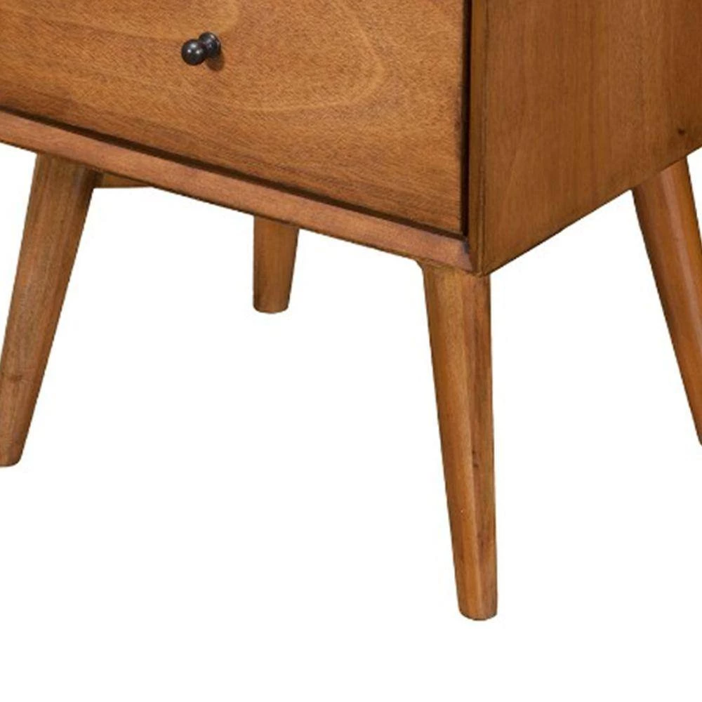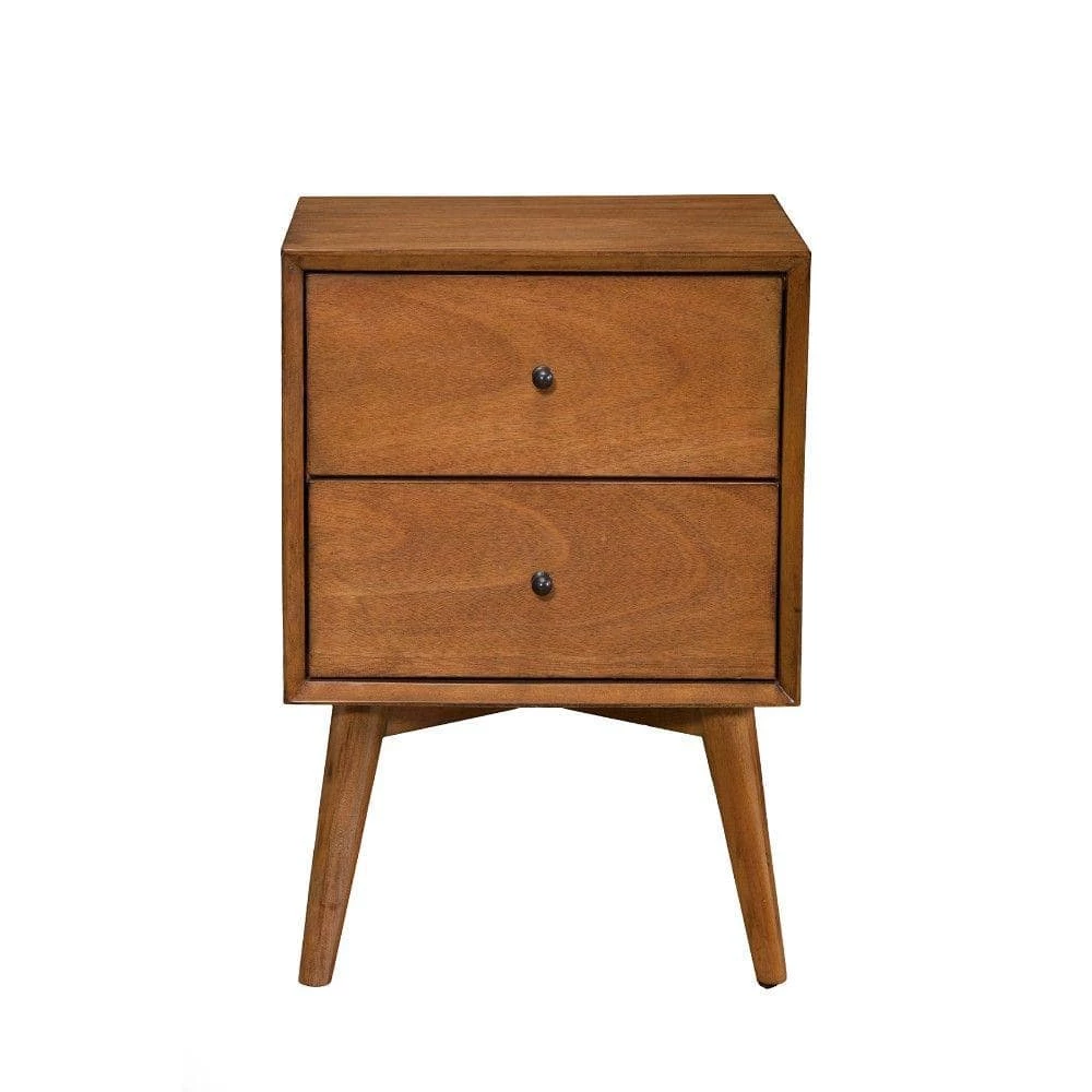 Fashioned with a modern style sense, this midcentury modern nightstand will beautifully accompany your bed. Crafted from mahogany solids and okoume veneer. This nightstand features 2-drawers. (Primary Color: Warm Color).