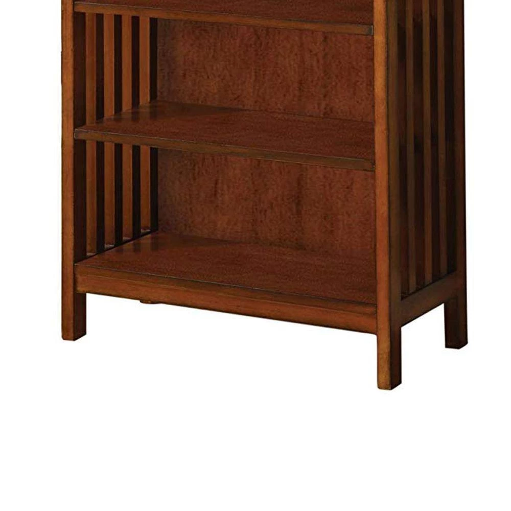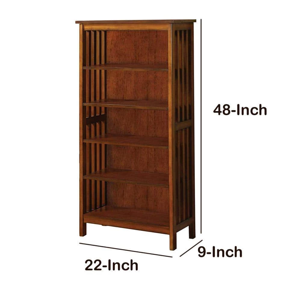 Typical mission styling with lattice molding and solid wood construction provide sturdy yet functional storage for books, media or knickknacks. Five convenient shelves along with a warm antique oak finish make this a perfect accent piece for any room in the house. It will enhance the look of the room.