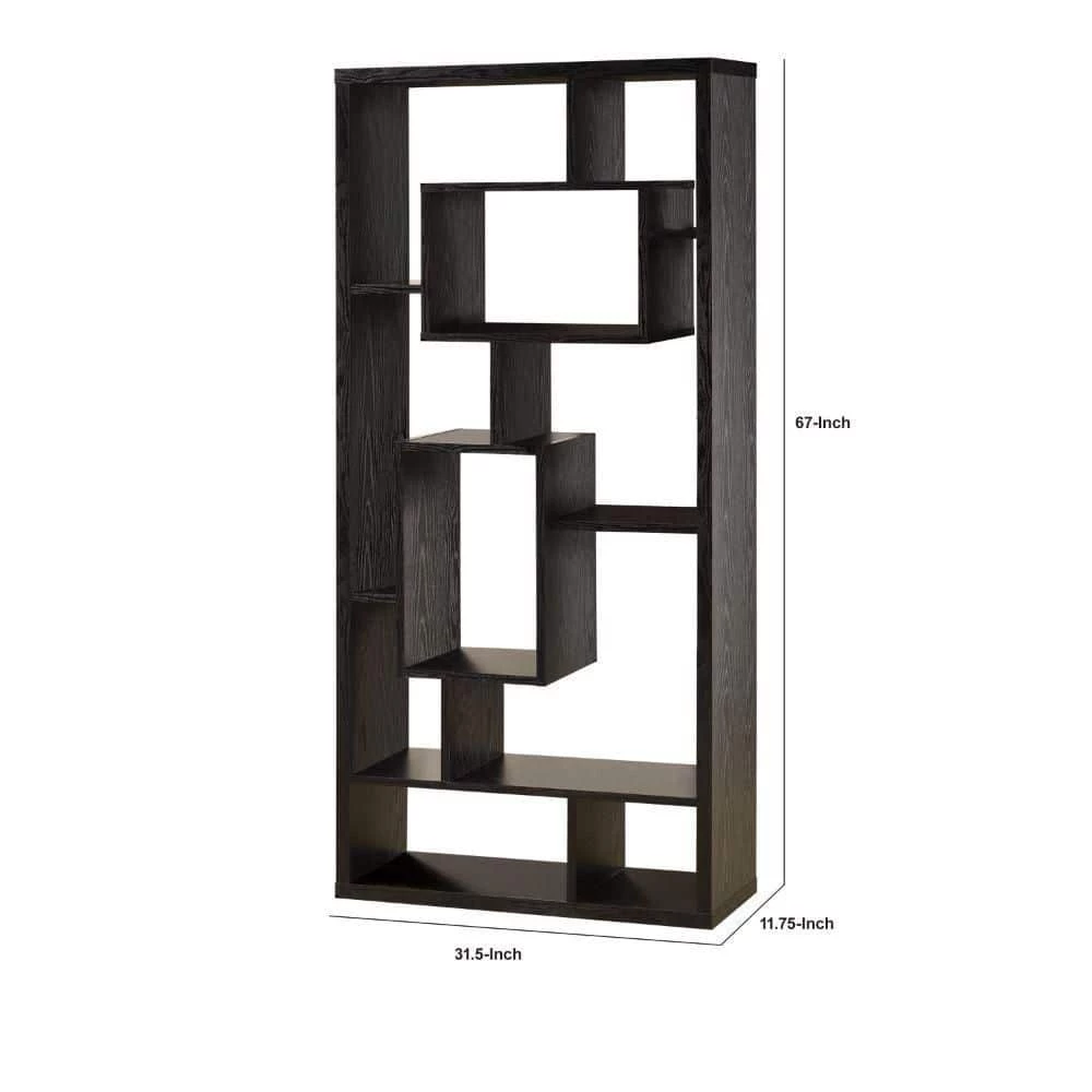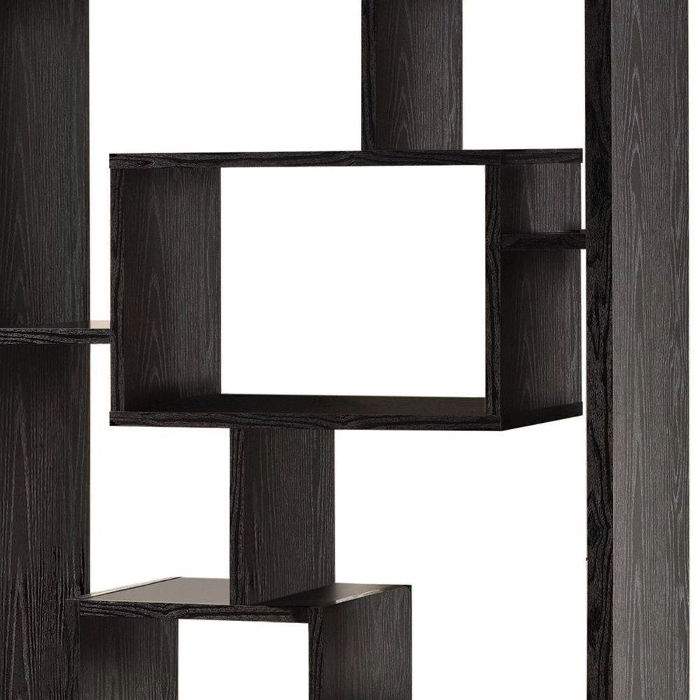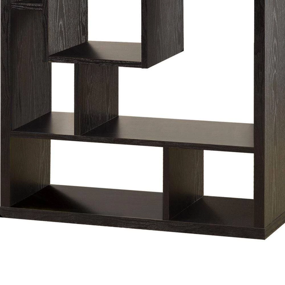 With a contemporary edge that is sure to draw the eyes, this asymmetrical backless bookcase is visually appealing and structurally stimulating. Featuring cube shelves of varying sizes, it has multiple shelf surfaces for home accents and d?cor of your choosing. Decorate with photo frames, vases, collectibles, books, and other accent items. With a black finish and intricate modern design, it makes a bold statement to liven up any room.
