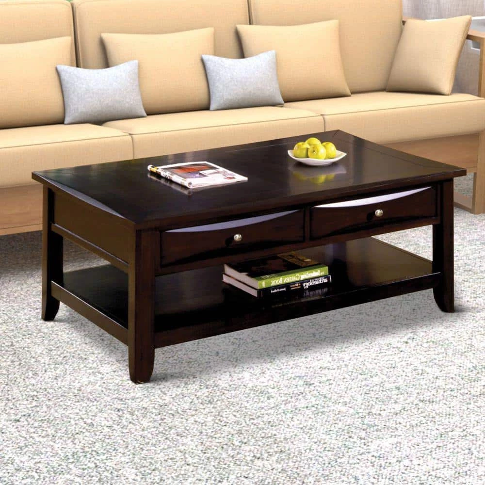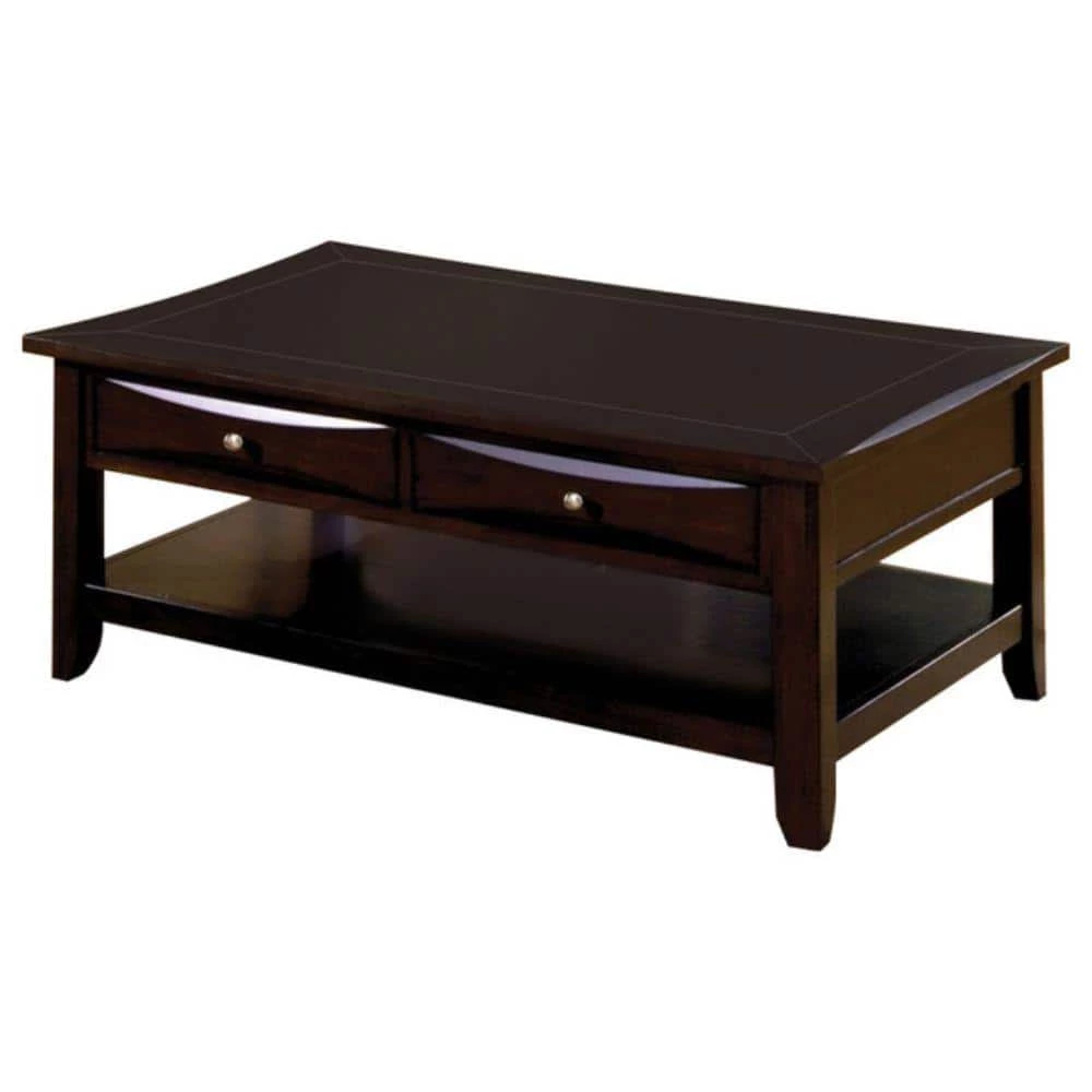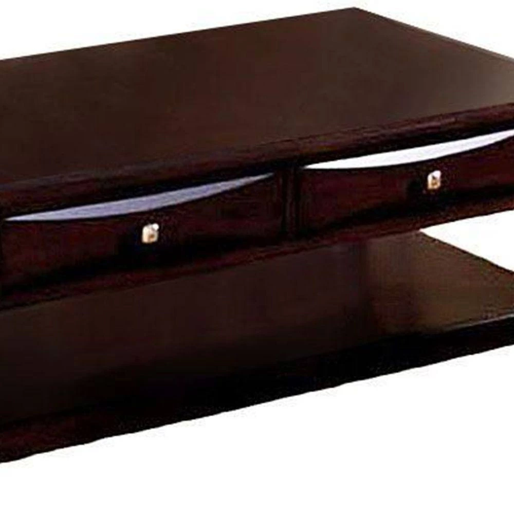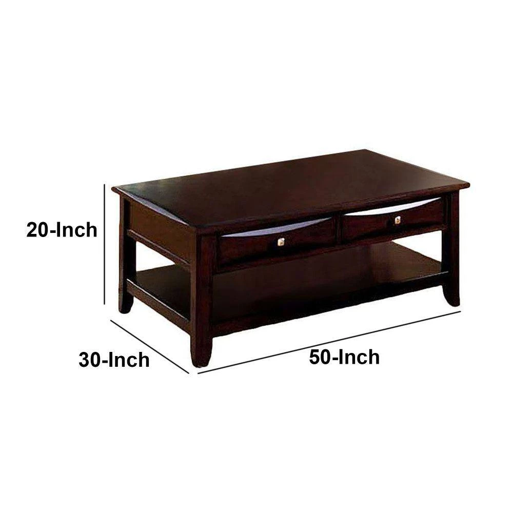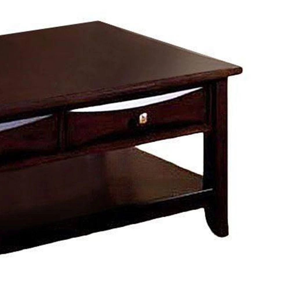 Add a tint of style and glamour to your home with the inclusion of this sturdy wooden constructed coffee table featuring transitional style. Rectangular in shape, it has 2 drawers incorporated with square metal pulls and 1 open bottom shelf which provides ample space for storage. Chamfered legs act as a sturdy support.
