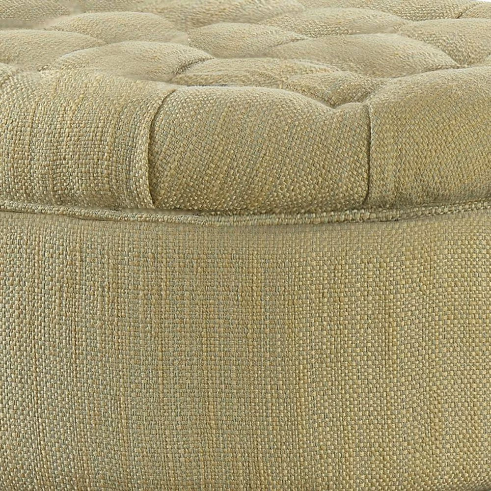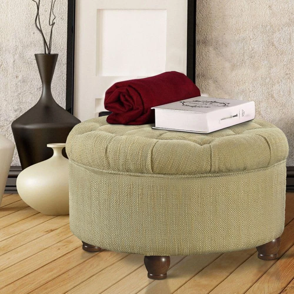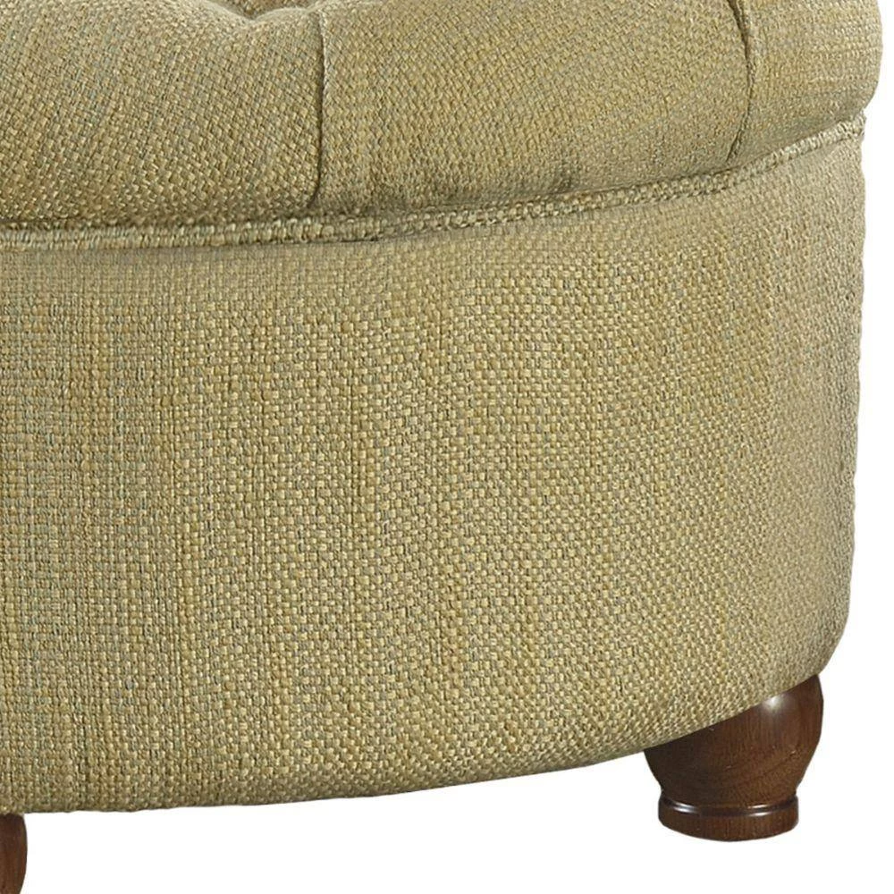 Bring this round shaped ottoman, to create a stylish statement and to add versatility in your home. With wooden frame, this beige and brown woven textured tweed fabric upholstered ottoman, has button tufted lift off lid, providing storage space to store linens, drapes, blankets and other items in sleek concealed way. Use this ottoman as a coffee table, place it in your living room or bedroom as a storage space to keep controllers, remotes or extra pillows, blankets or also can be used as an additional seating.