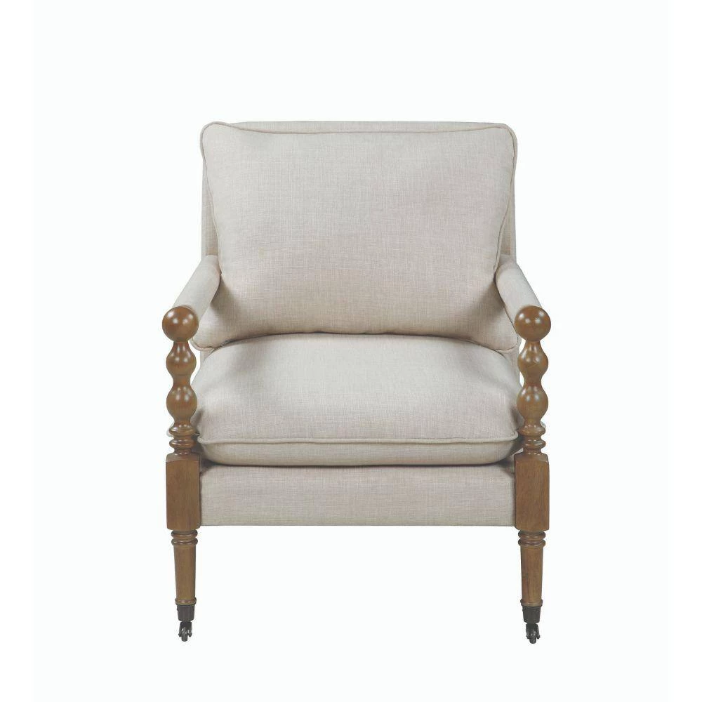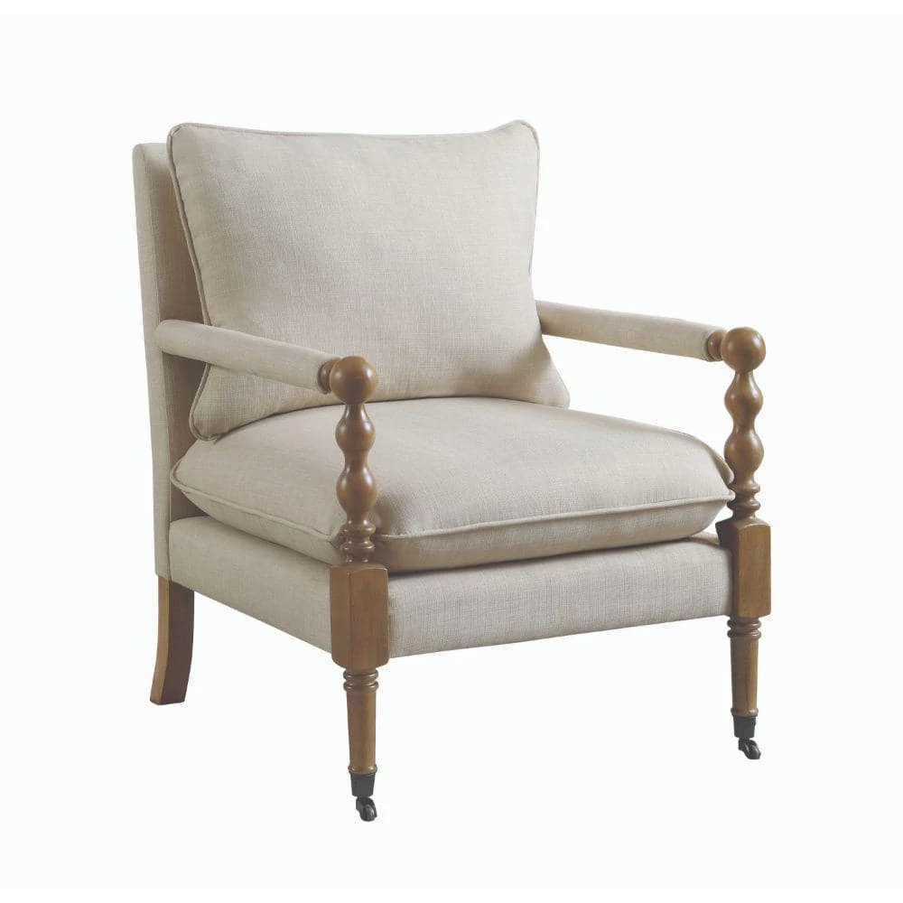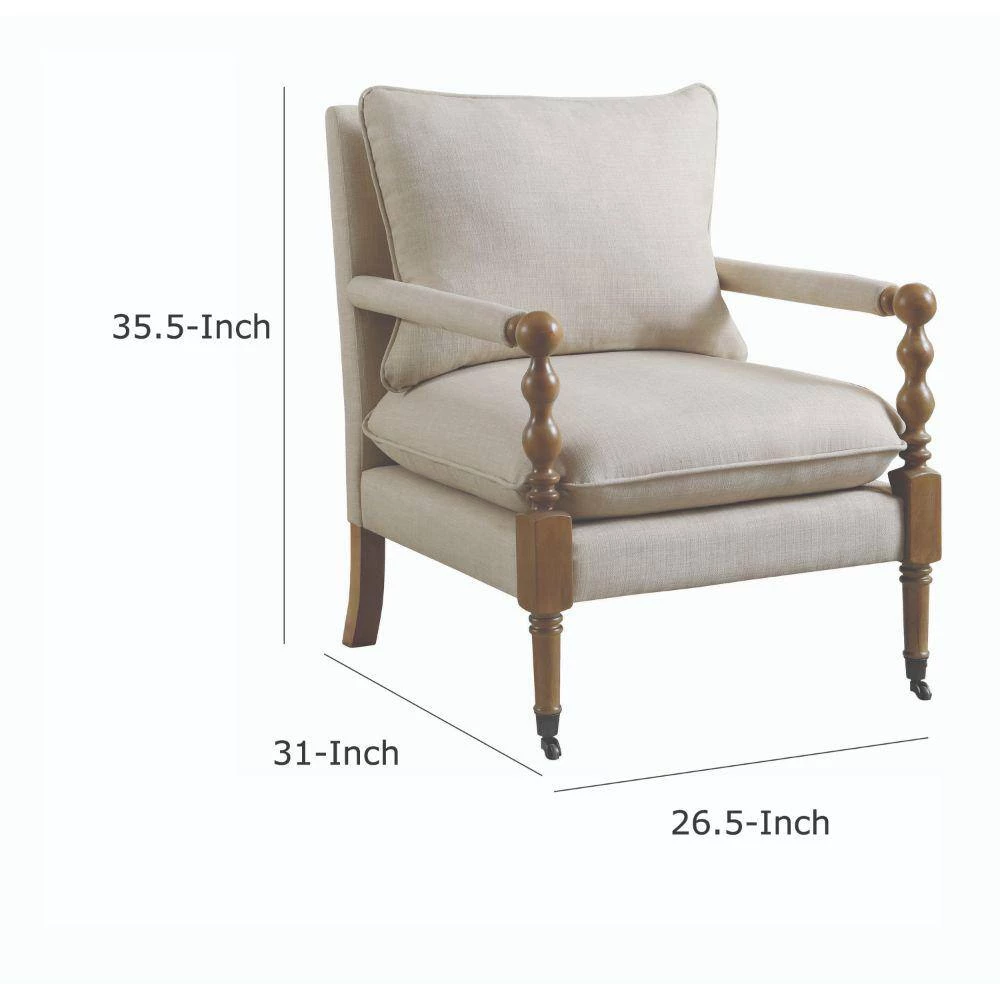 Bring an elegant charm to your home with the addition of this transitional style accent chair, features good quality wood constructed frame covered in a beige fabric that uplifts its inviting style to new heights. The cushioned seat and back along with manchette armrest offer a blissful comfort even after long hours of seating while the complete structure is supported by turned front legs and front back legs, in which the turned legs accented with decorative casters. It will enhance the beauty of your space.