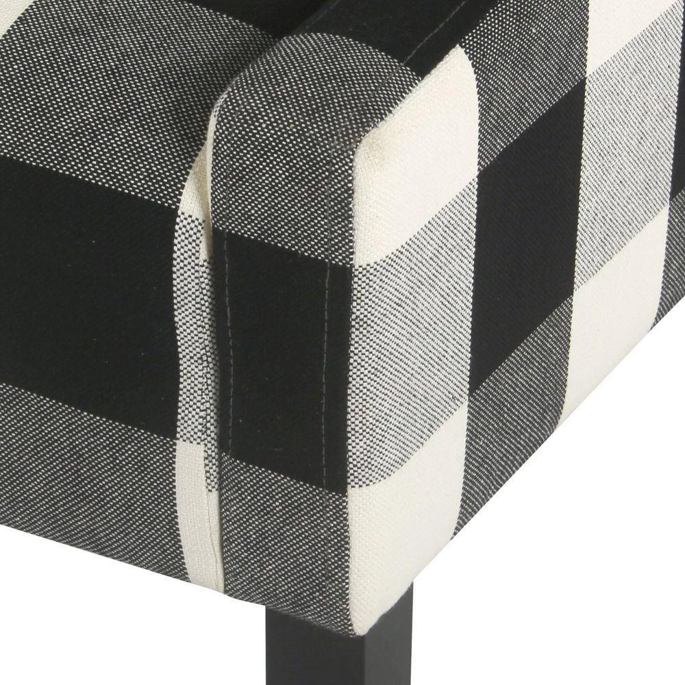 - The fabric upholstery of this chair features a striking buffalo plaid pattern for added visual interest