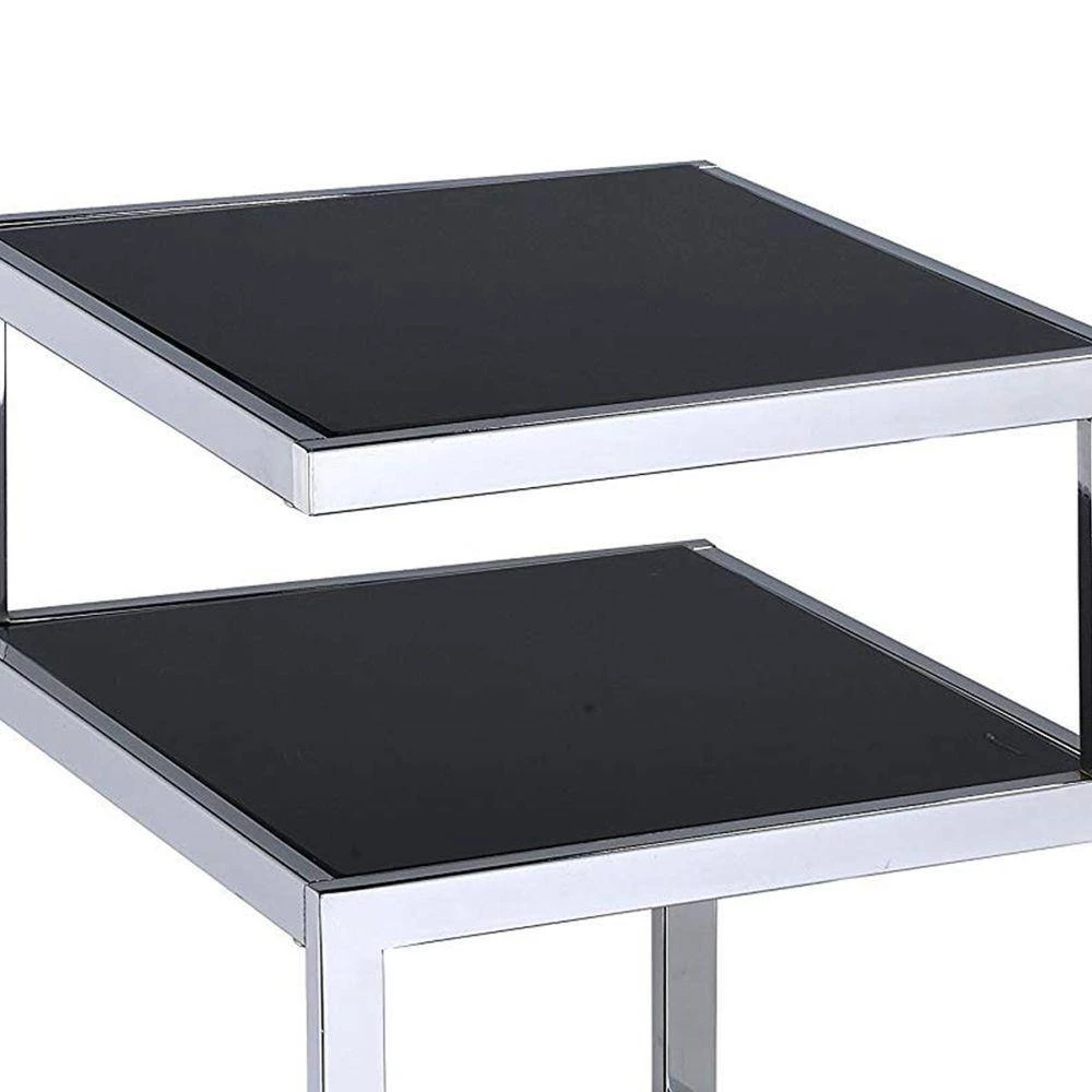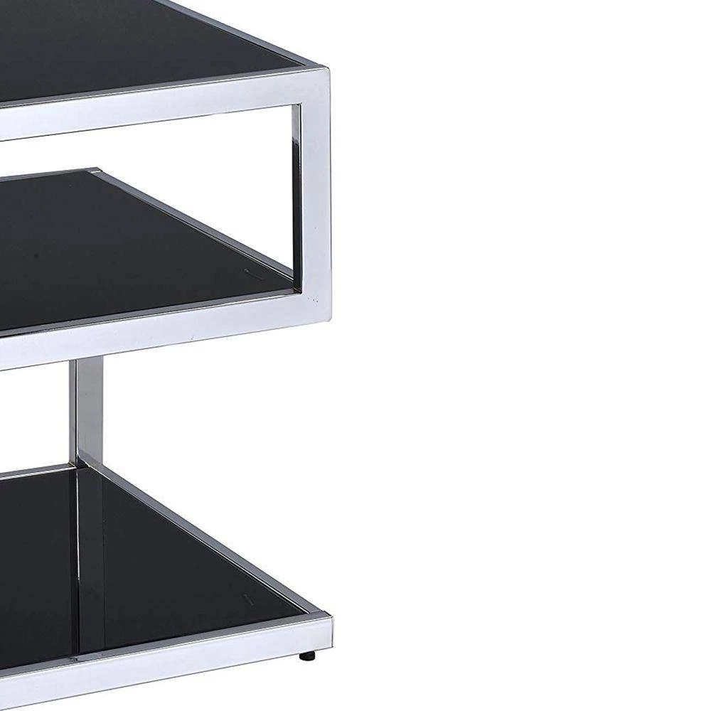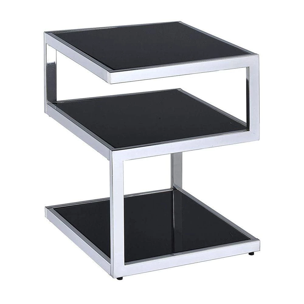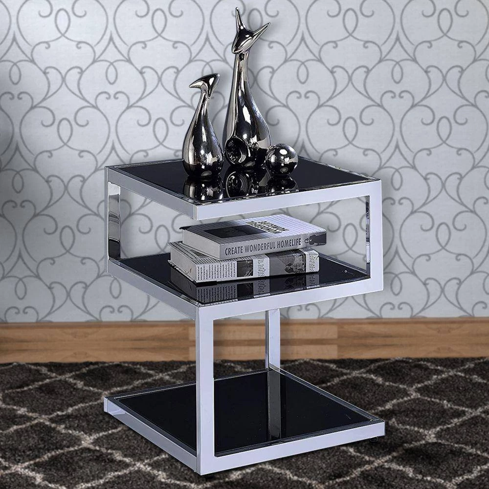The occasional table collection it’s a balancing act of sorts. This unique table is fun and functional, features 3-tier shelves design. The mix of black glass and chrome metal frame work is a modern style masterpiece. This will enhance the look of the room.